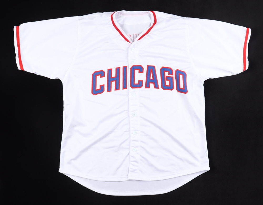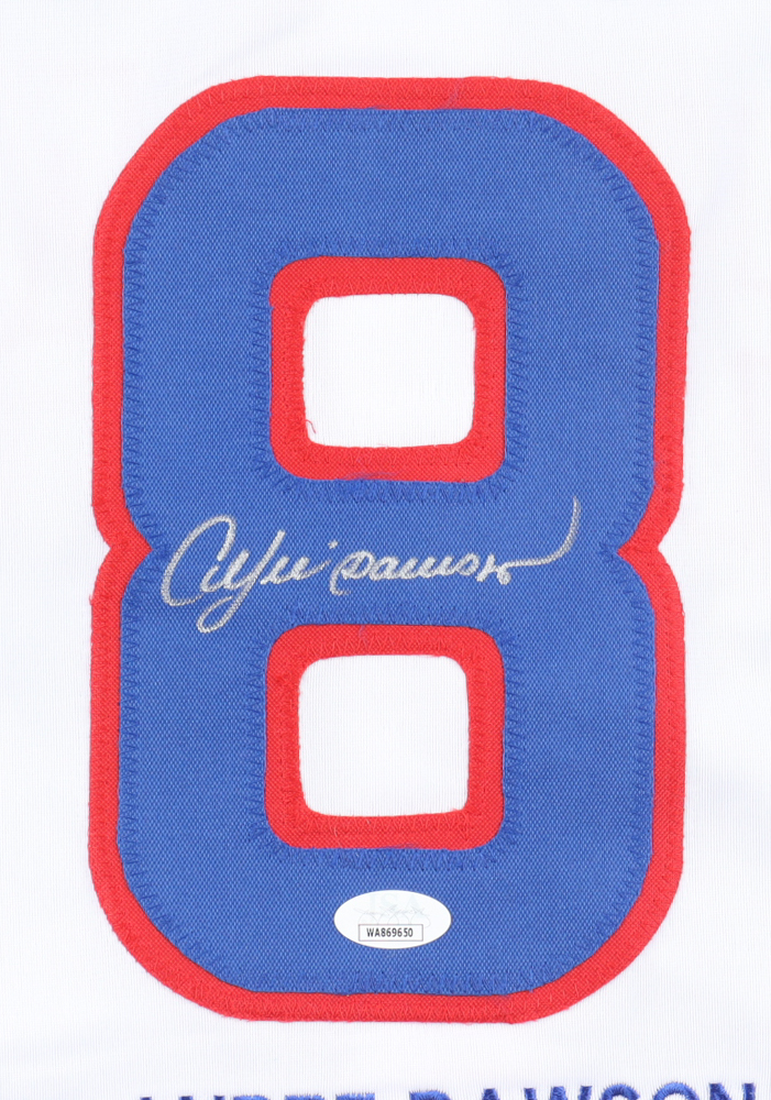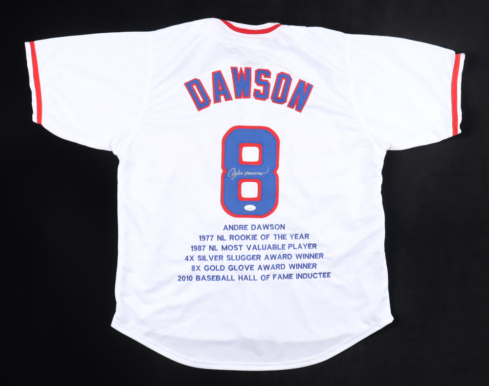 Custom jersey. Everything sewn on, size XL. Hand-signed by Andre Dawson (HOF). Please note that Dawsons' career stats have been sewn on below the reverse numbers.