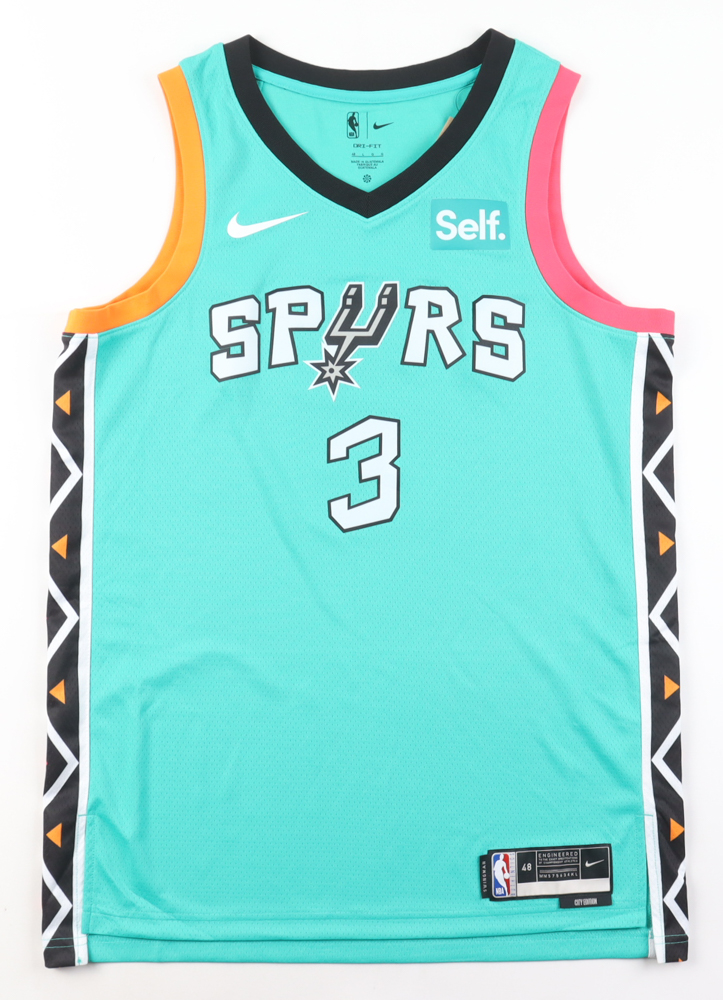 Nike jersey. Everything is pressed on, size 48. Hand-signed and inscribed by Keldon Johnson (San Antonio Spurs). Please note, there is a stain below the reverse number and the inscription has bled.