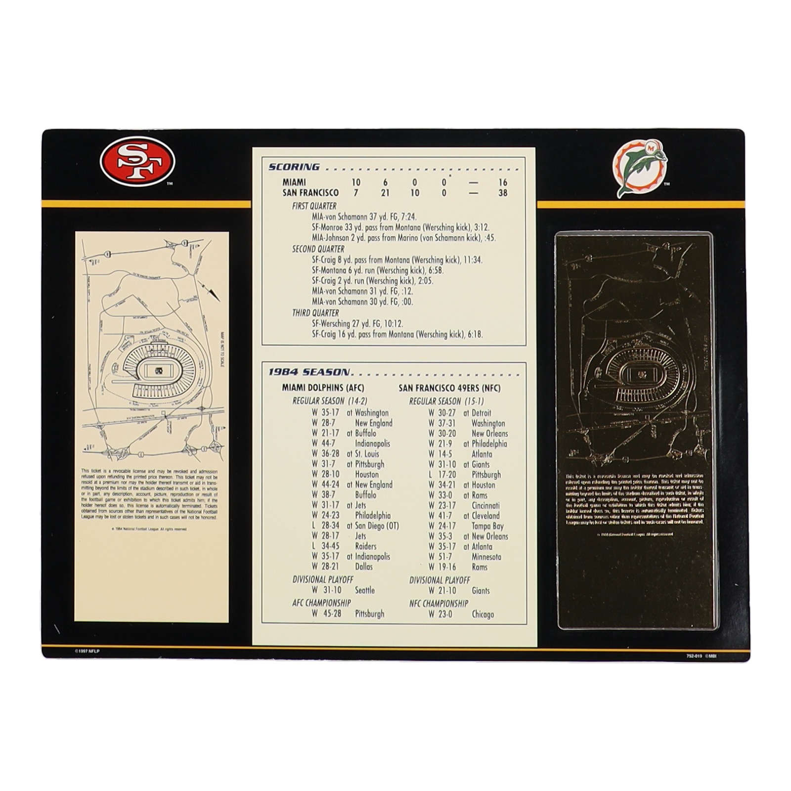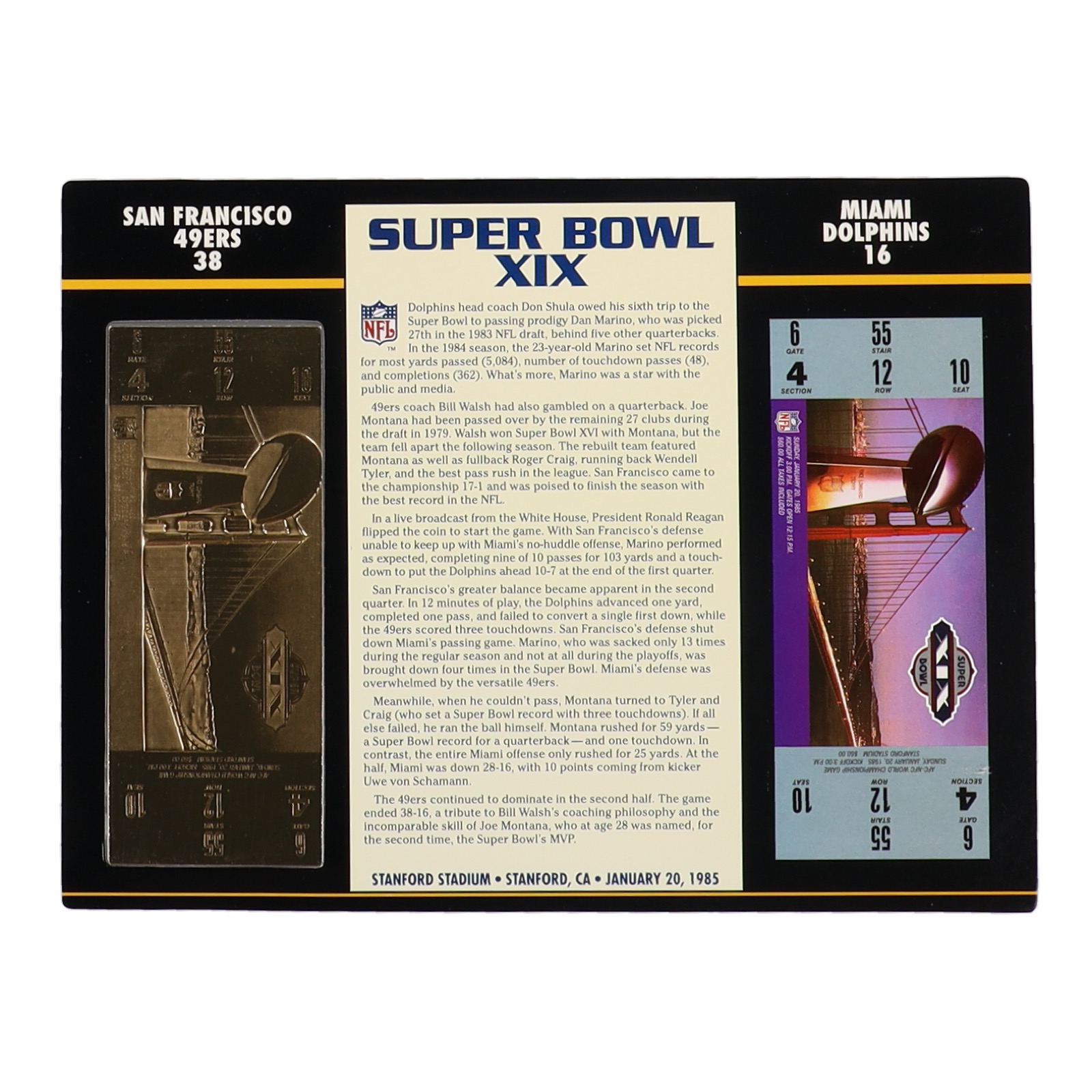 Super Bowl XIX Commemorative 9x12 Score Card Display with 22KT Gold Ticket
