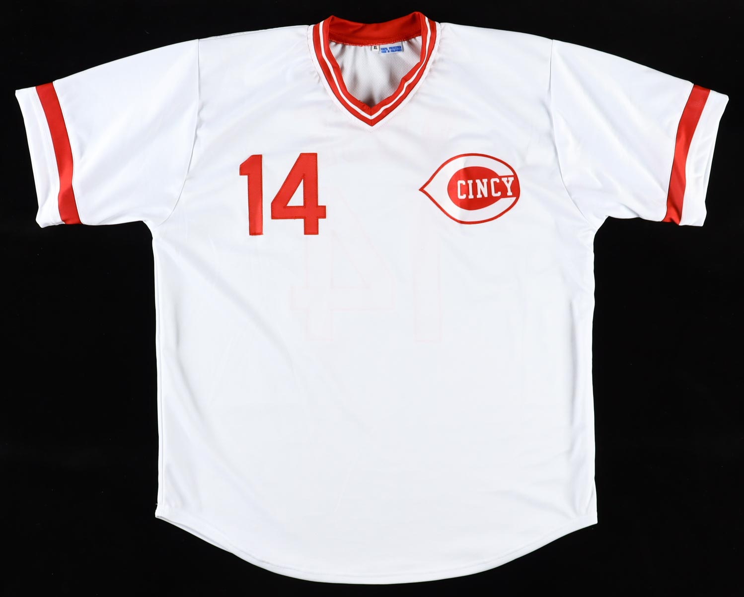 Custom jersey. Everything is sewn on, size XL. Has been hand-signed by Pete Rose.