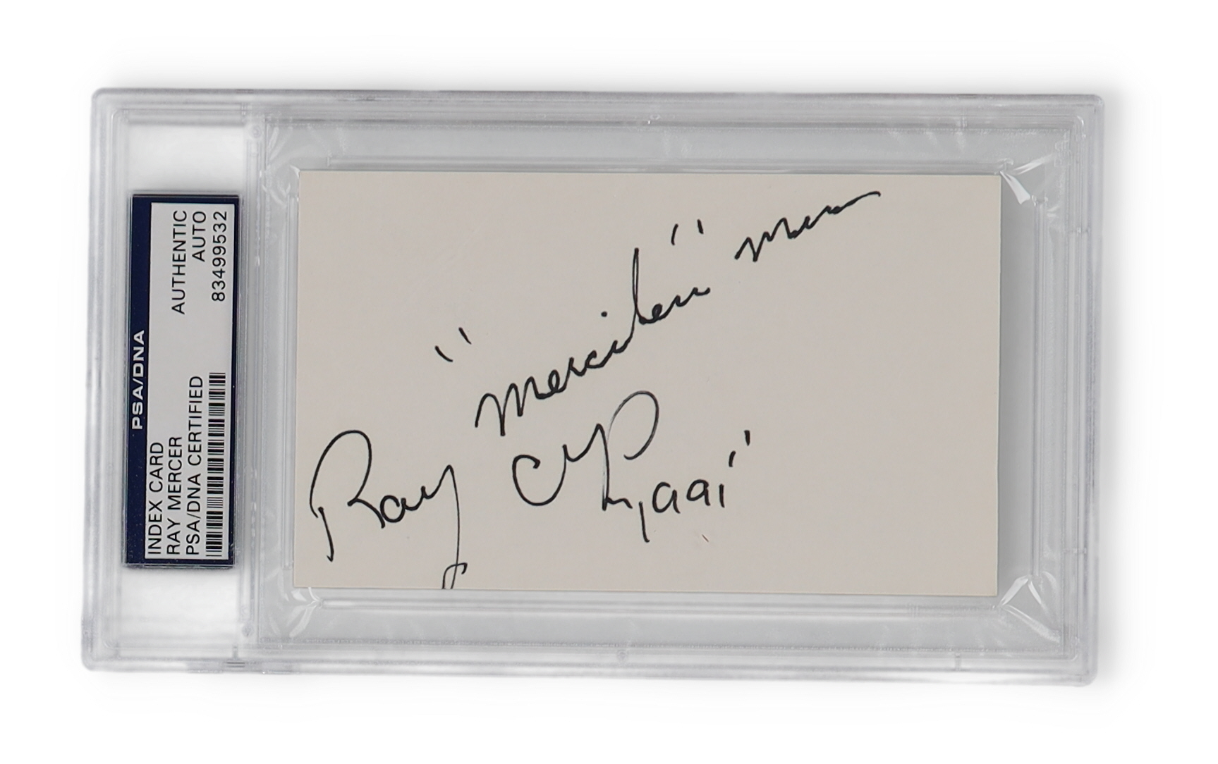 Index card measures 3" x 5" in size. Hand-signed and inscribed by Ray Mercer.
