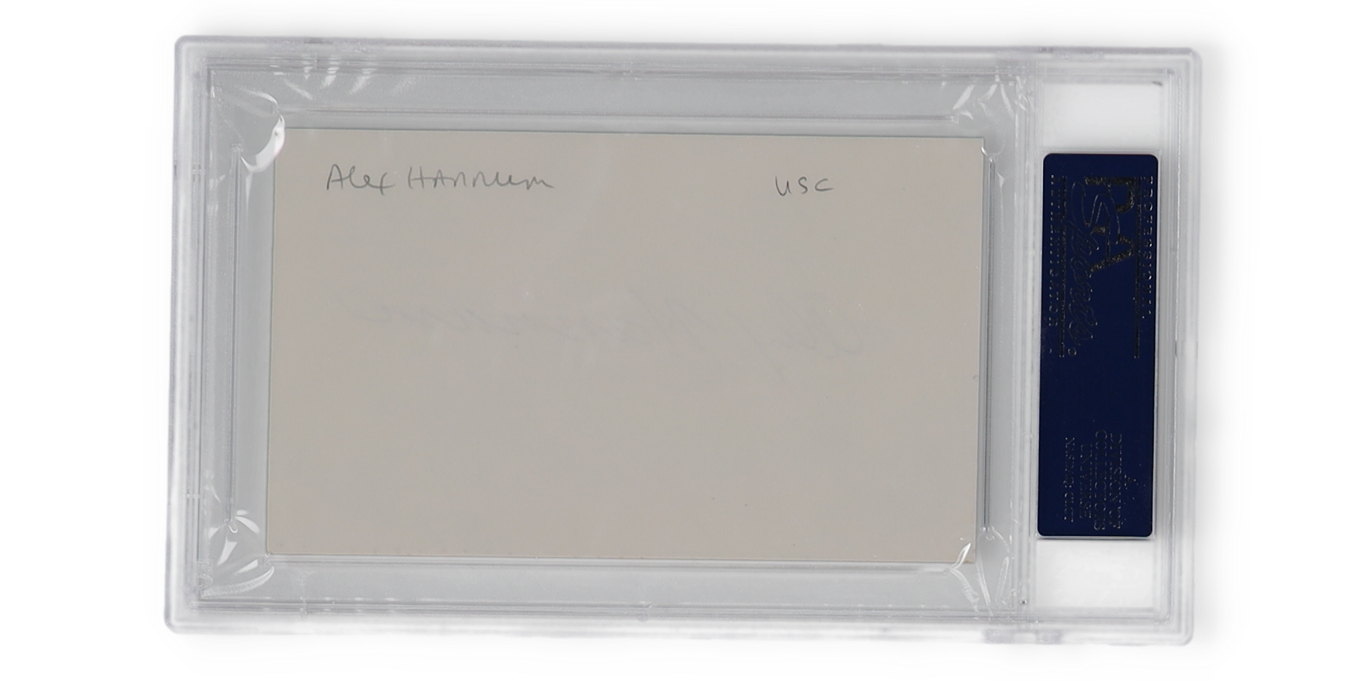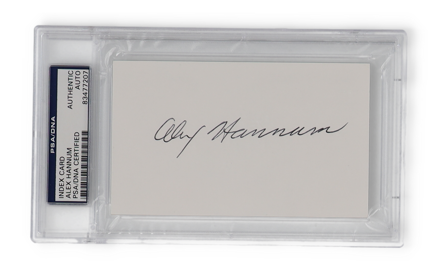Index card measures 3" x 5" in size. Hand-signed by Alex Hannum (D. 2002, St. Louis Hawks, HOF).