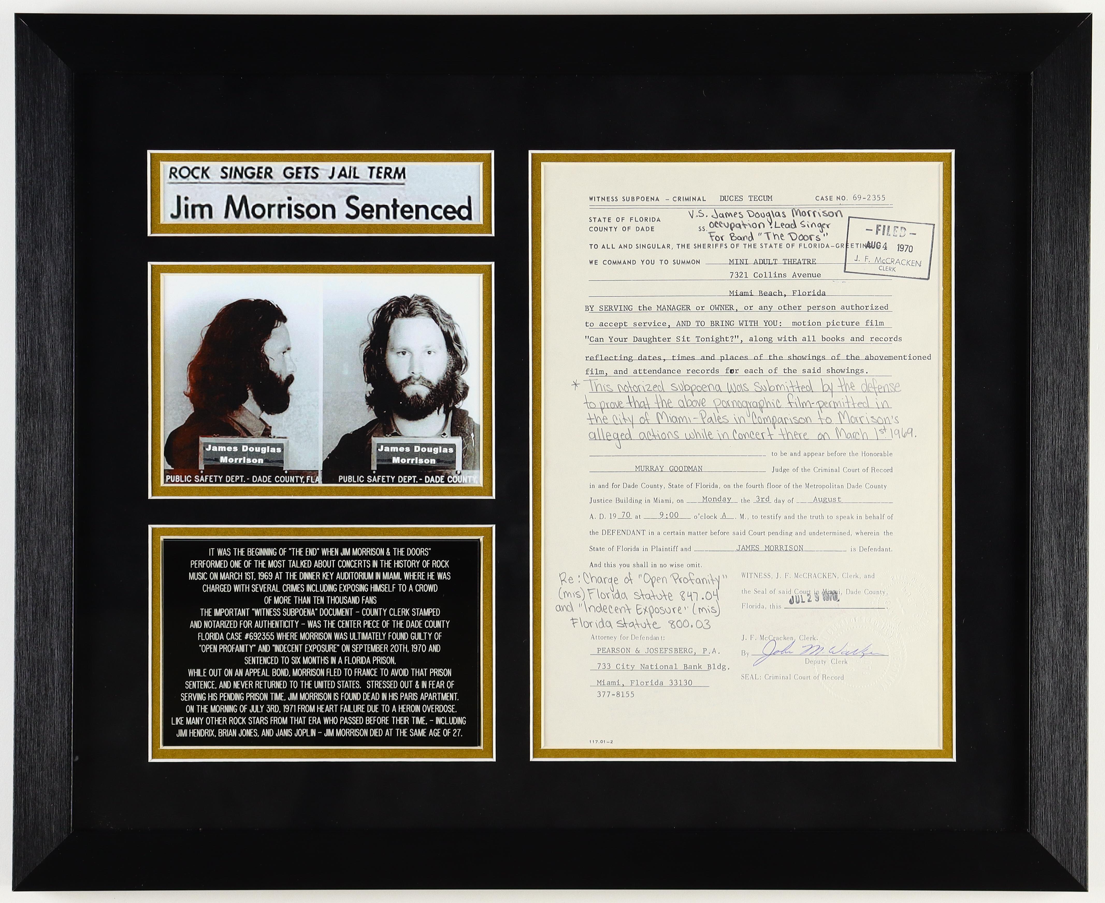 Jim Morrison Custom Framed Original 1970 Public Court Ordered Subpoena Letter
