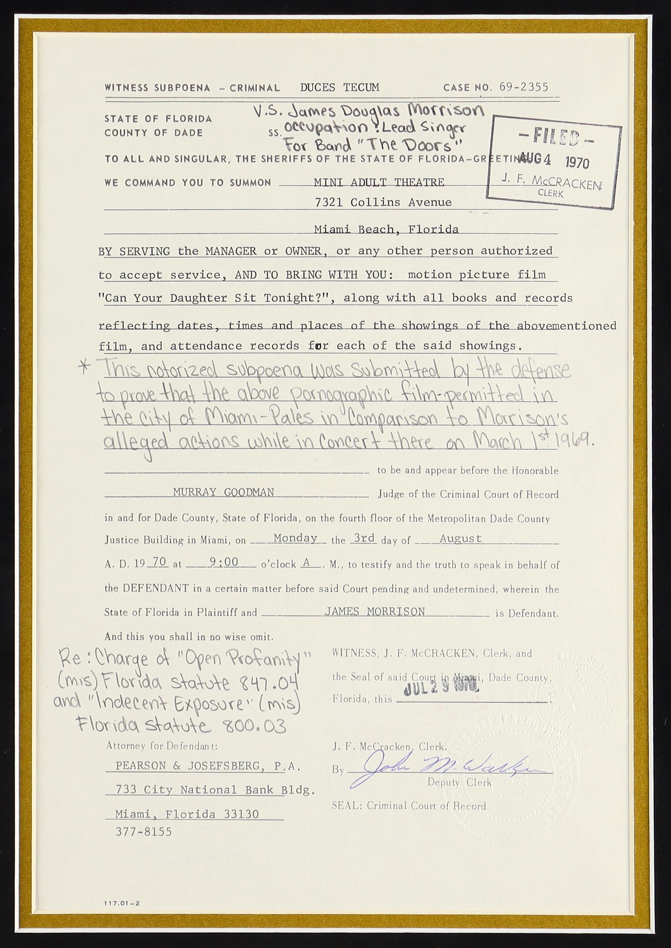 This important “Witness Subpoena Document” - County Clerk Stamped and Notarized for Authenticity - was the centerpiece of the Dade County Florida Case #692355 where Morrison was ultimately found guilty of “Open Profanity” and “Indecent Exposure” on September 20th, 1970 and sentenced to 6 months in a Florida Prison.