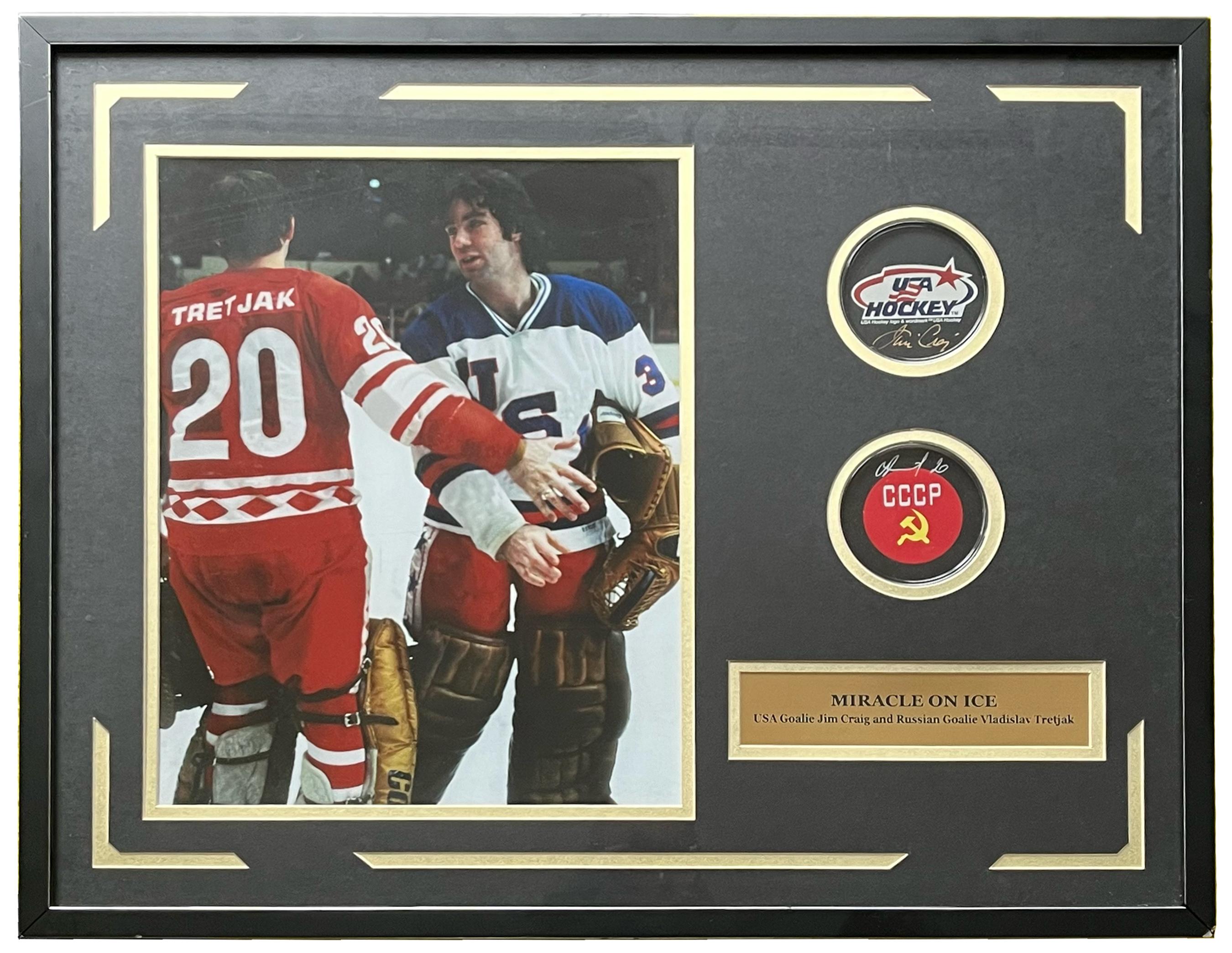 Jim Craig & Vladislav Tretiak Signed "Miracle on Ice" Custom Shadowboxed Hockey Puck Display (JSA)