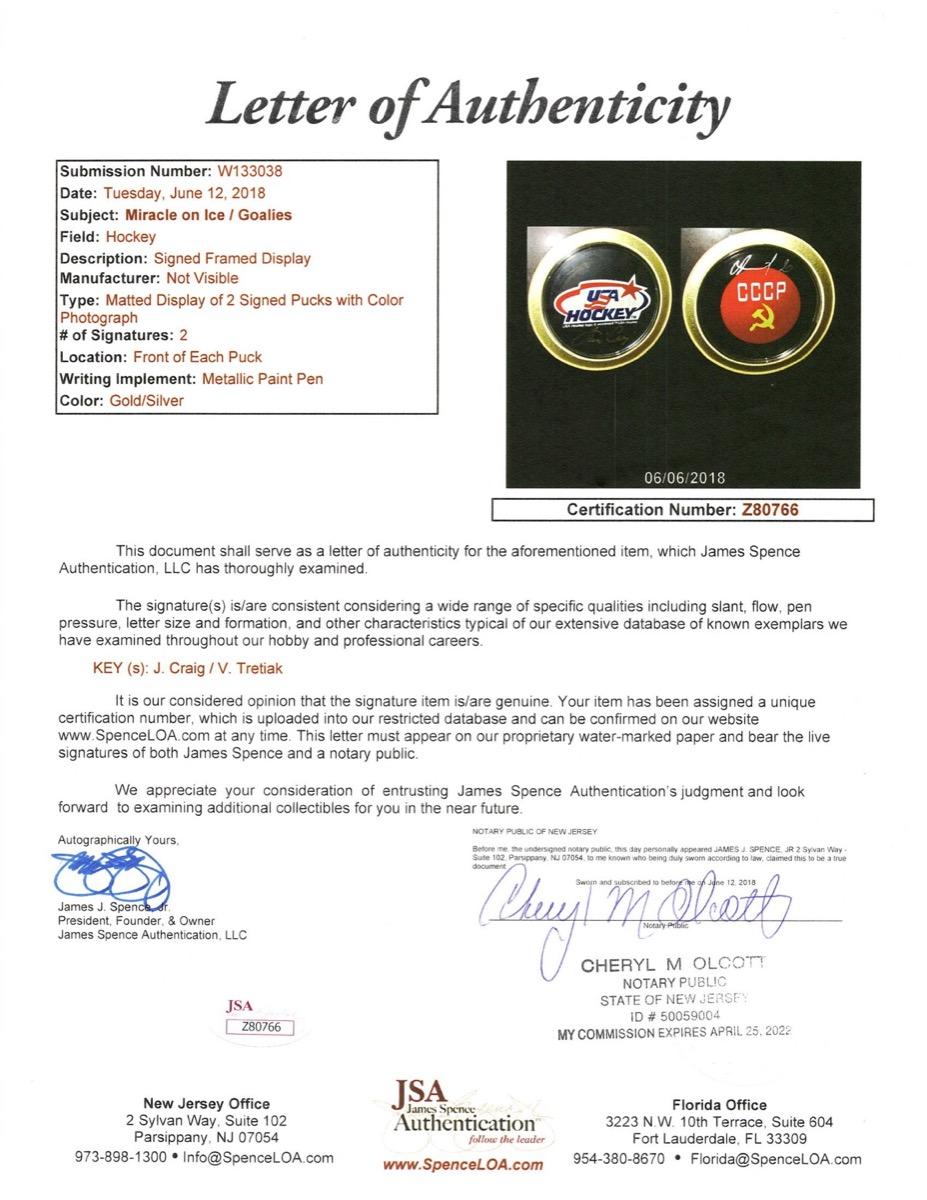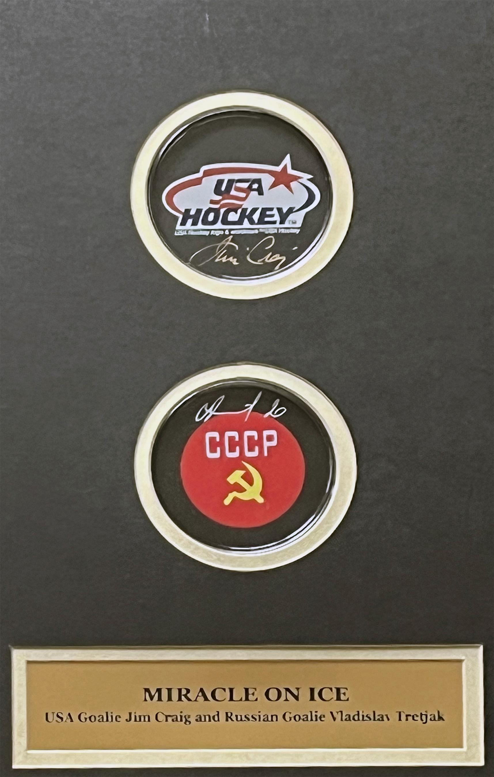 Custom shadowbox measures 19" x 24" in size and features (2) seperate hockey pucks that have been hand-signed by the goalies of the Gold Hockey game between USA and Russia, Jim Craig & Vladislav Tretiak!