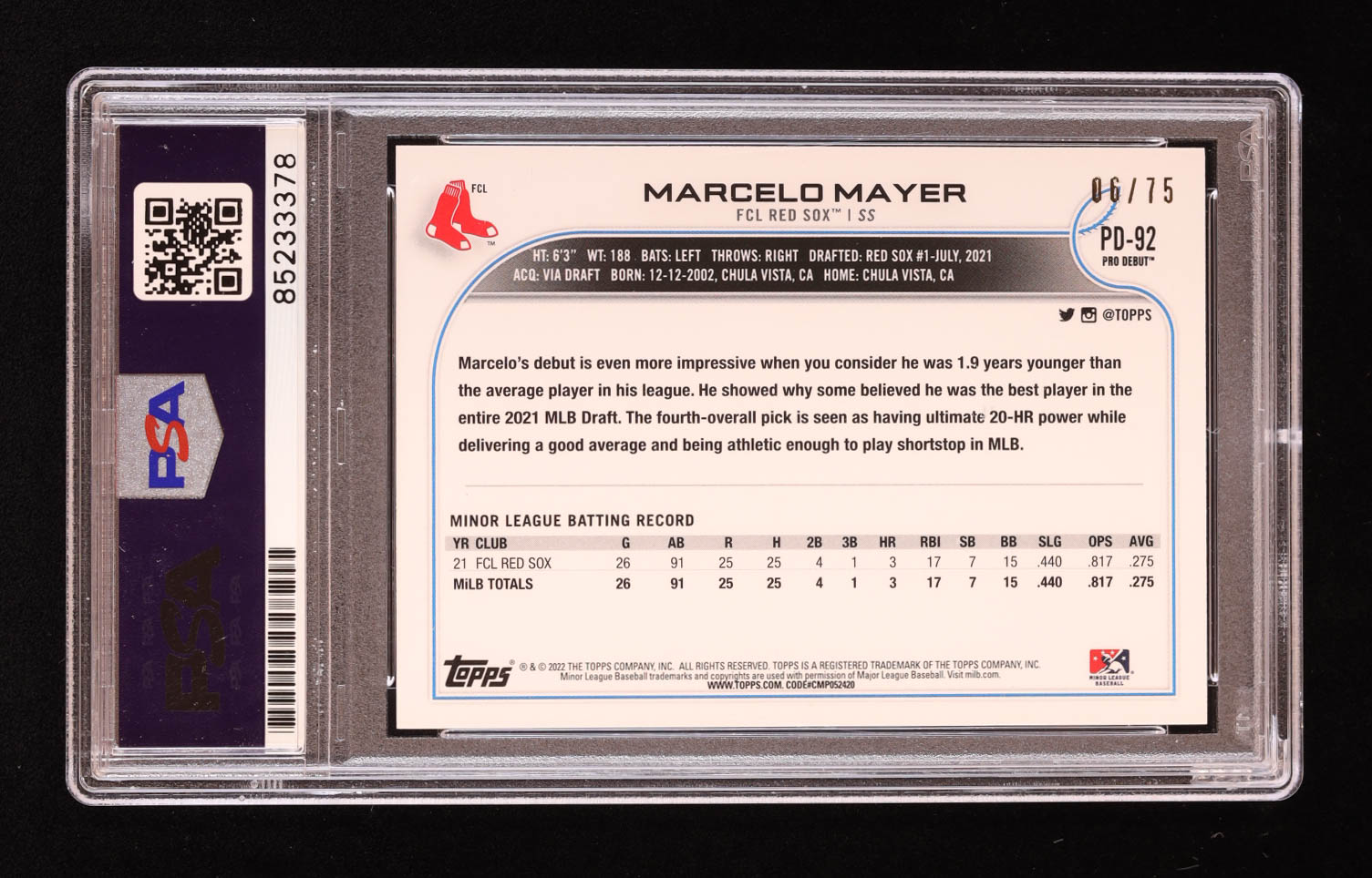 Marcelo Mayer Signed 2022 Topps Pro Debut Aqua #PD92 #06/75 RC (PSA)