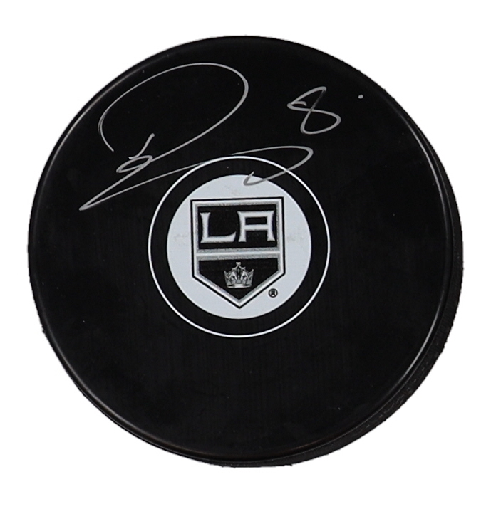 Los Angeles Kings logo hockey puck has been hand-signed by Drew Doughty.