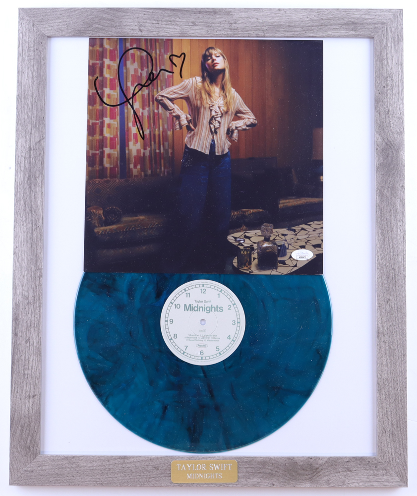 Custom frame measures approximately 18" x 22" in size. Features a "Midnights" record album insert that has been hand-signed by Taylor Swift. The display also includes a vinyl record.