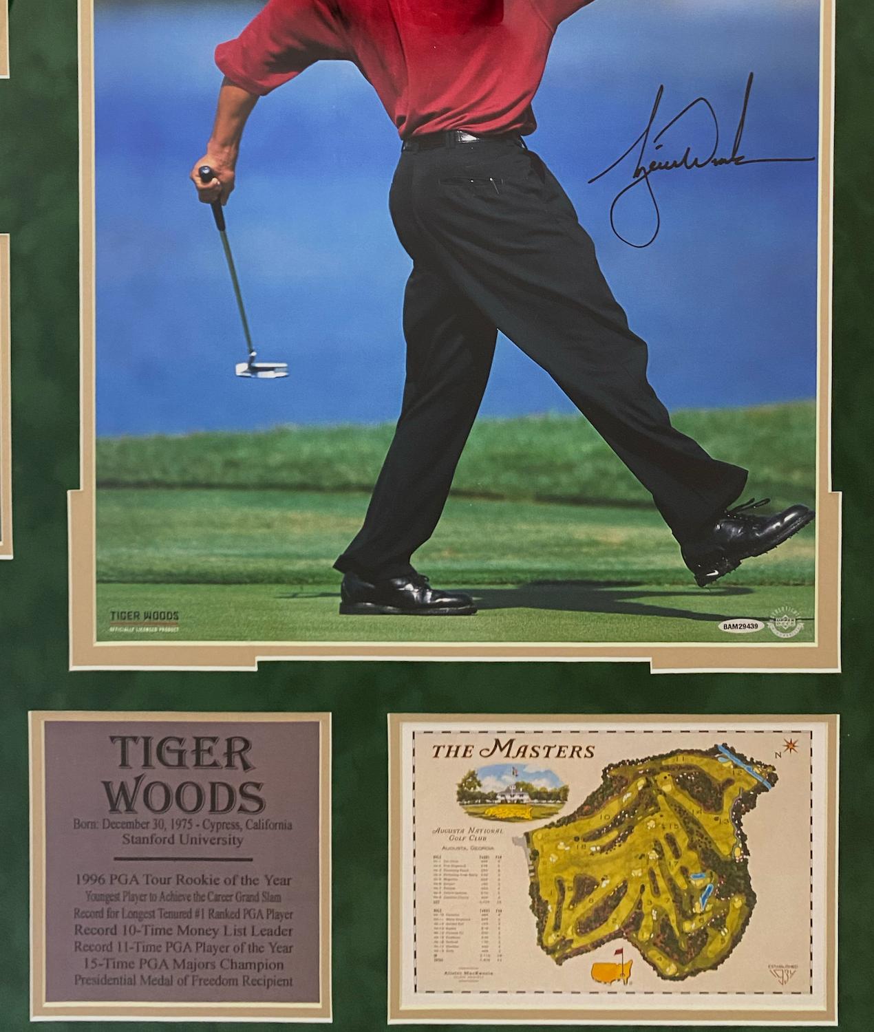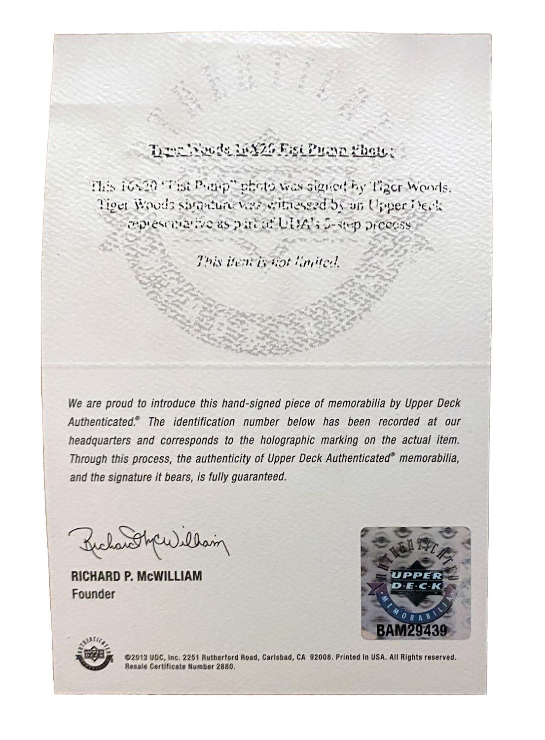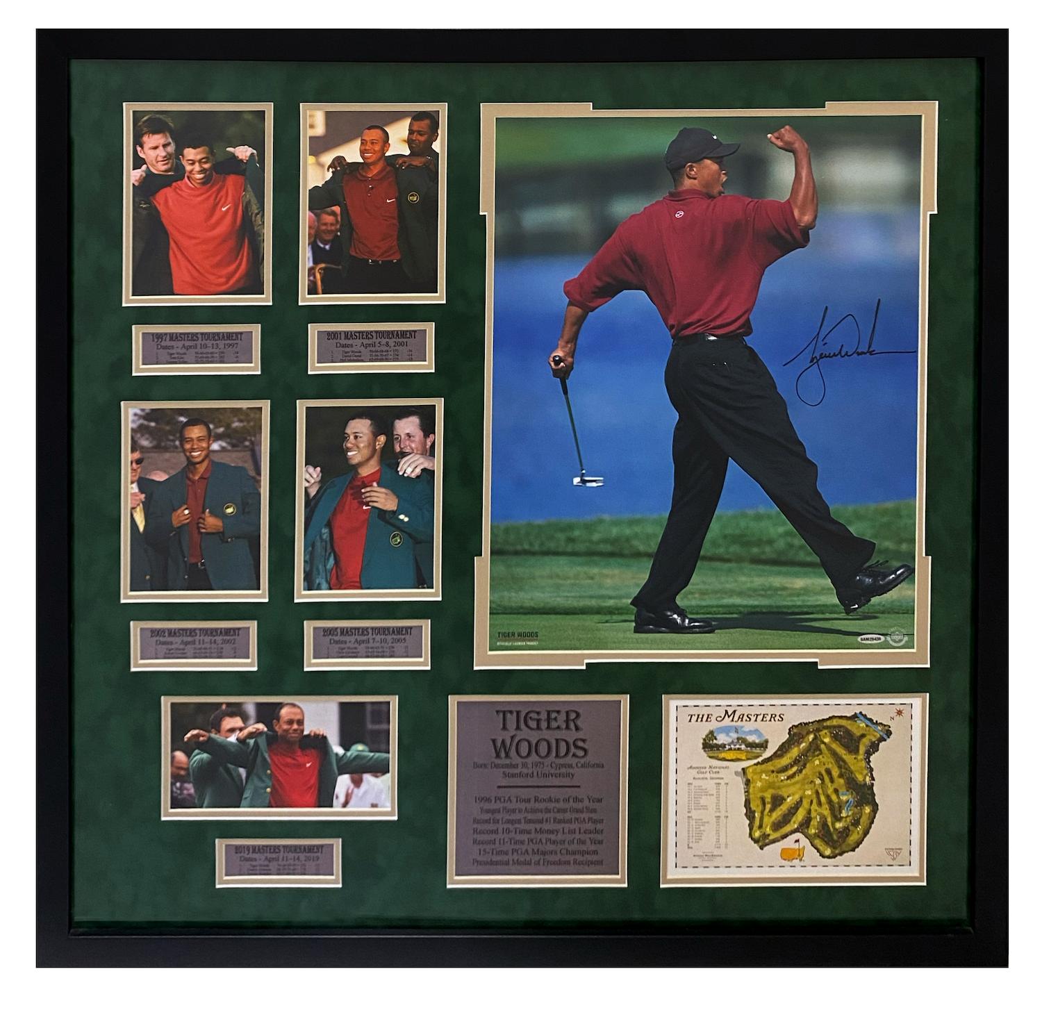 Custom frame measures 34" x 35" in size and features a "Fist Pump" photo that has been hand-signed by Tiger Woods.