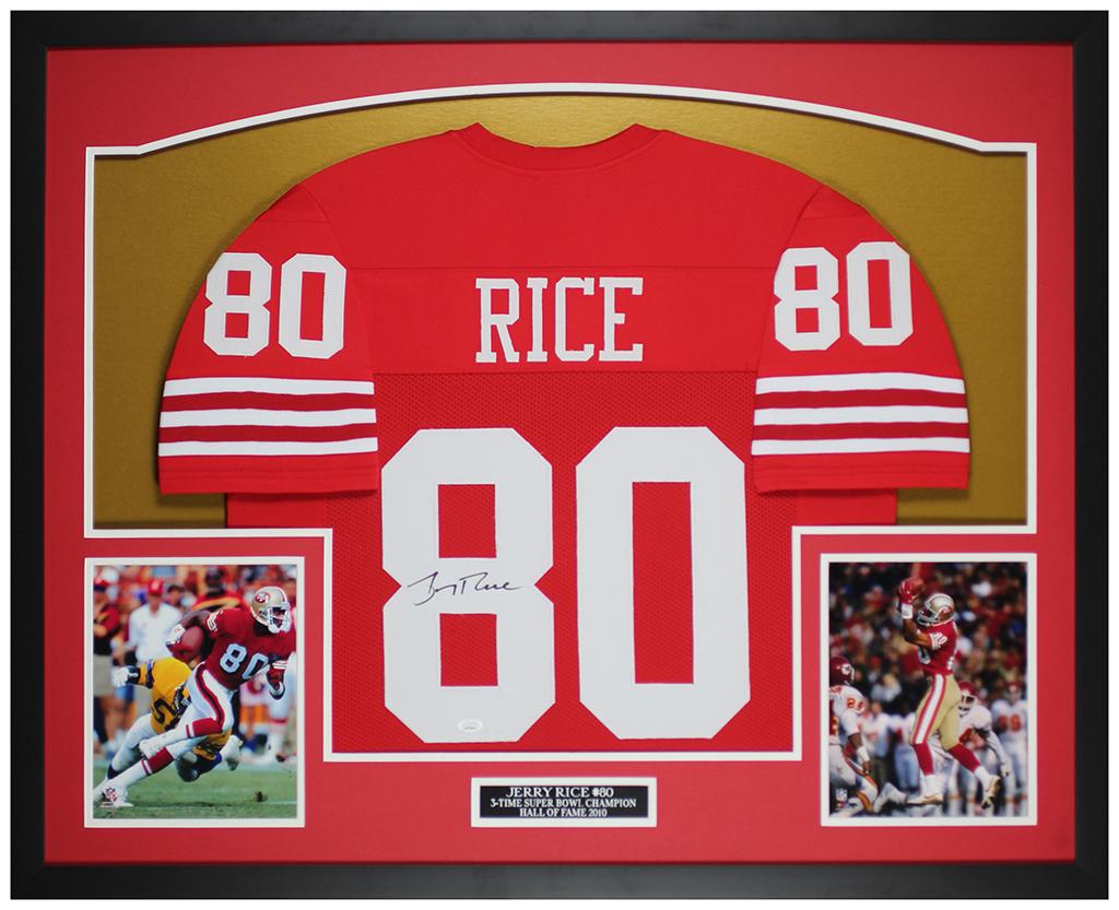 Custom frame measures 35” x 43” in size and features a jersey that has been hand-signed by Jerry Rice (HOF).