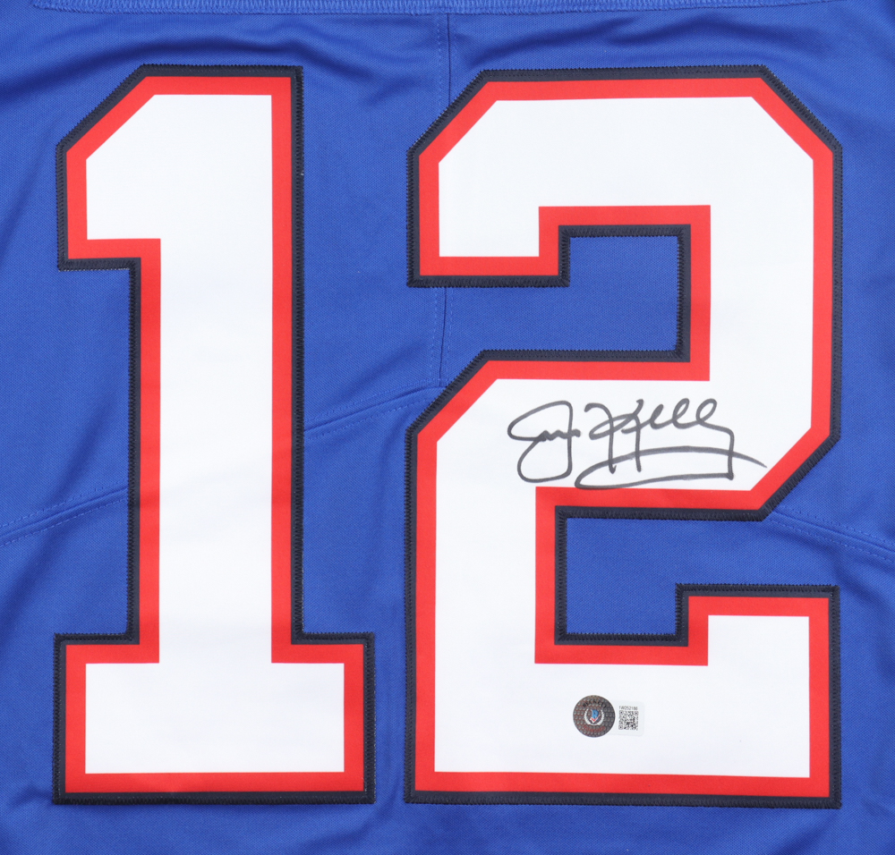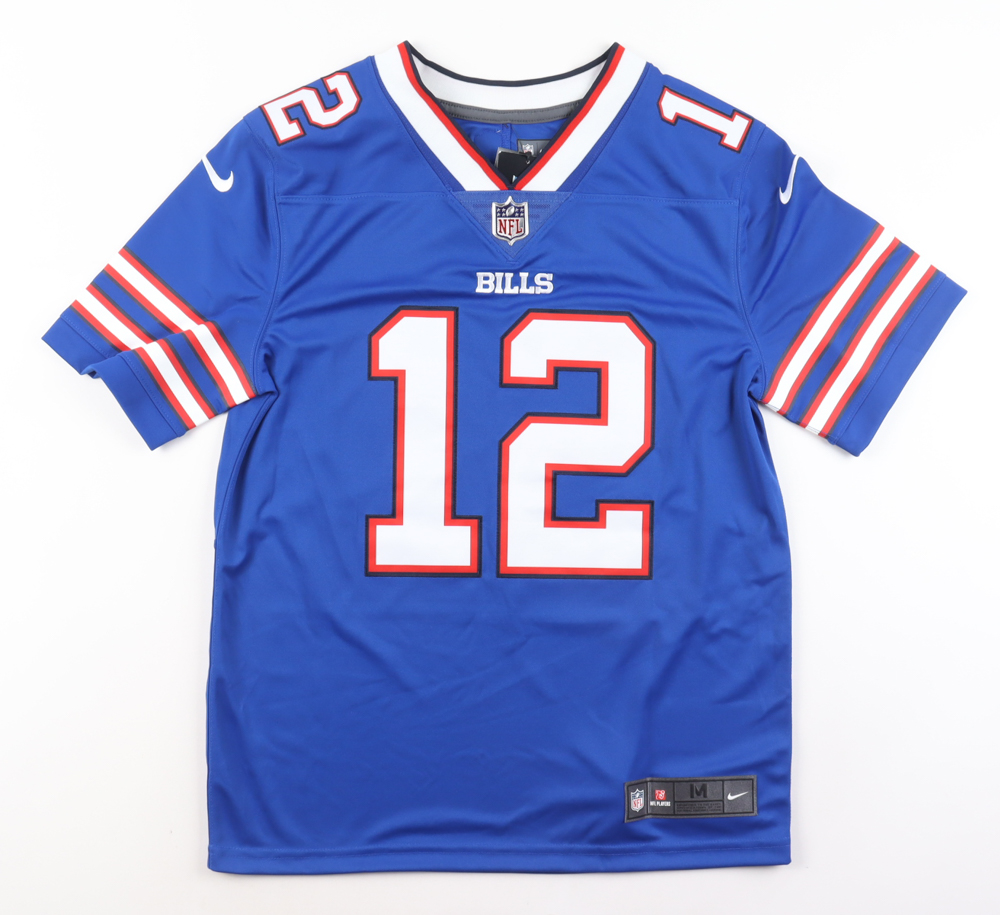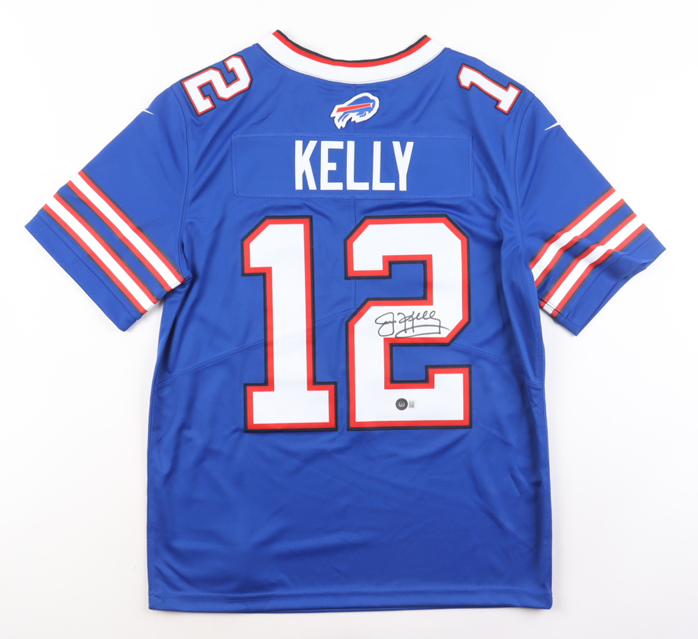 Authentic Nike jersey. Everything is sewn on, size M. Hand-signed by Jim Kelly (Buffalo Bills, HOF).