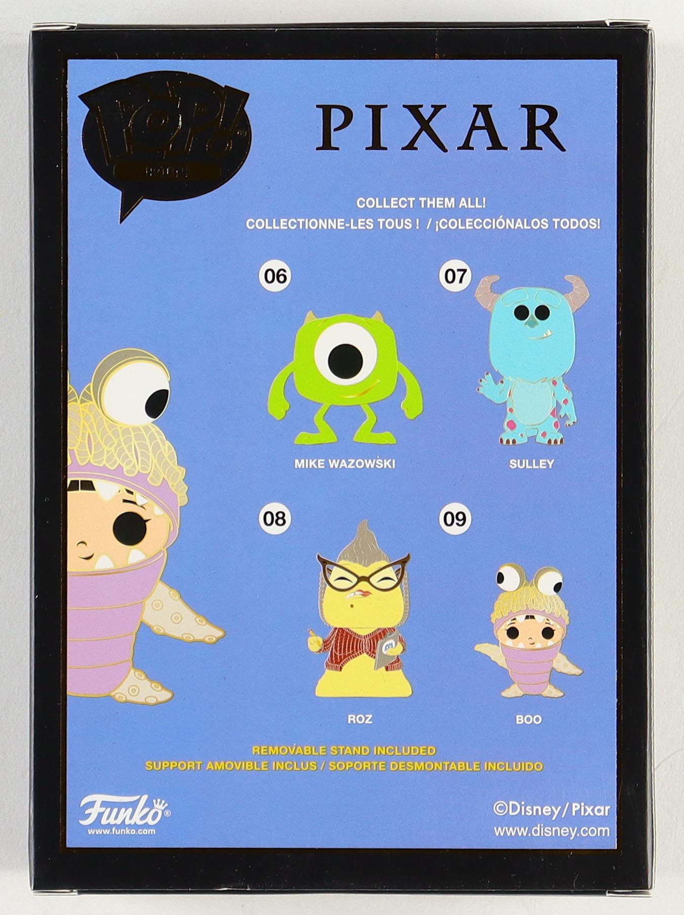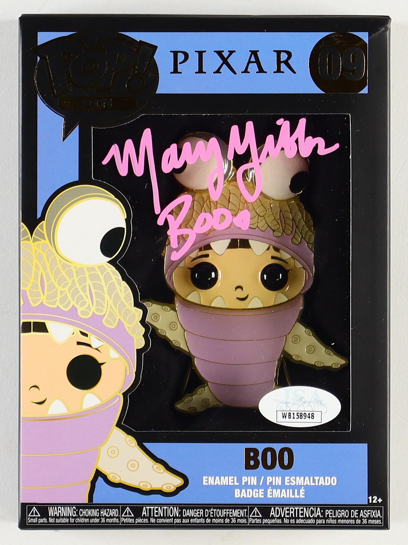 Funko Pop! enamel pin measures approximately 4" tall and has been hand-signed and inscribed on the packaging by Mary Gibbs (Voice of Boo).