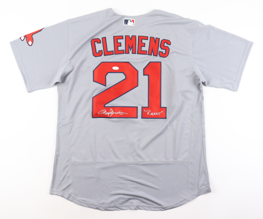 Nike jersey with everything sewn on, size 48. Hand-signed and inscribed by Roger Clemens (Boston Red Sox).