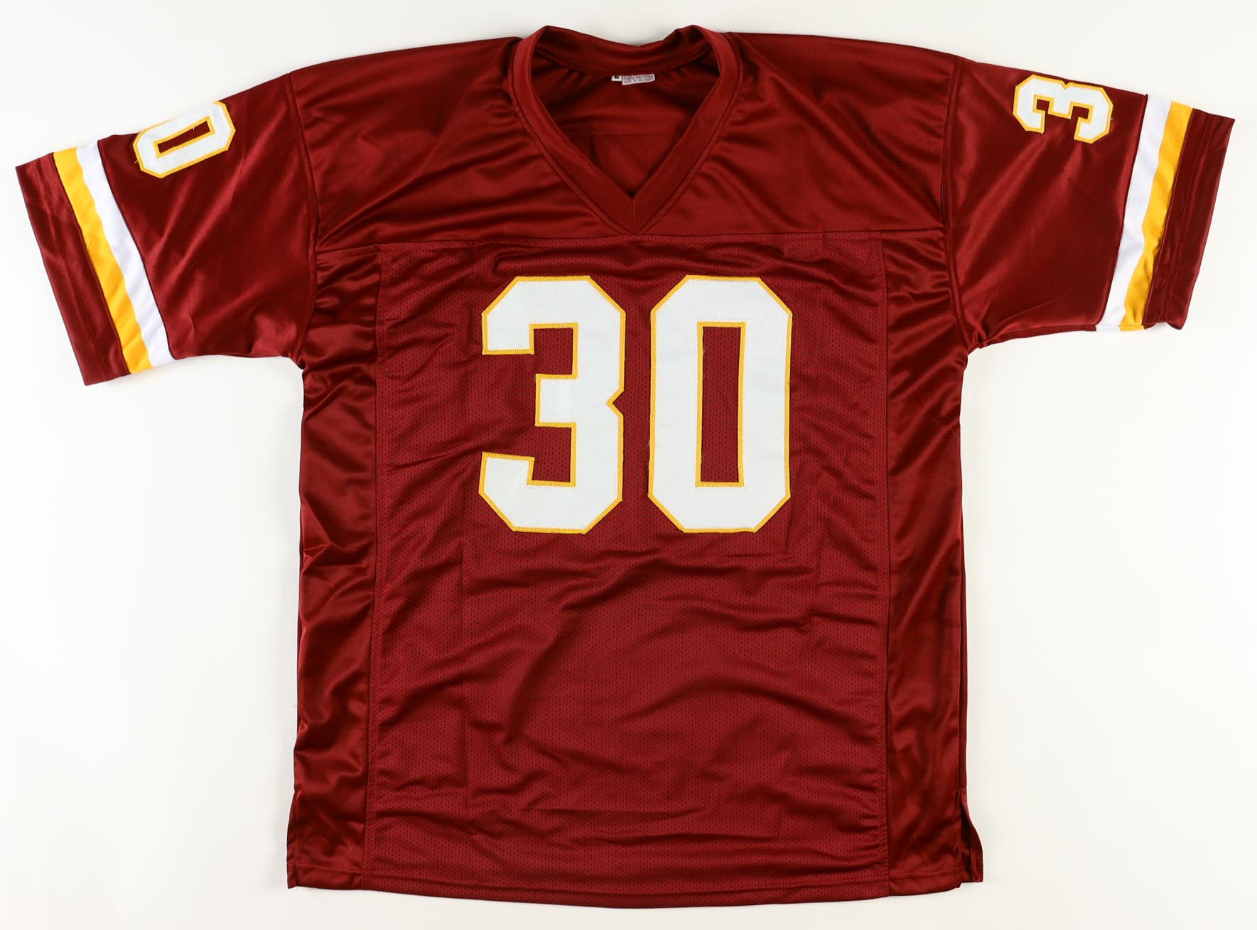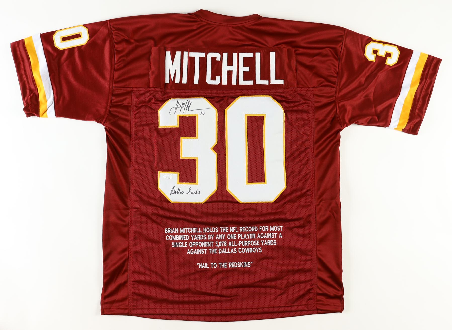 Custom jersey with everything sewn on, size XL. Has been hand-signed and inscribed by Brian Mitchell. Mitchell's career highlights have been custom stitched onto the back of the jersey below the reverse numbers.
