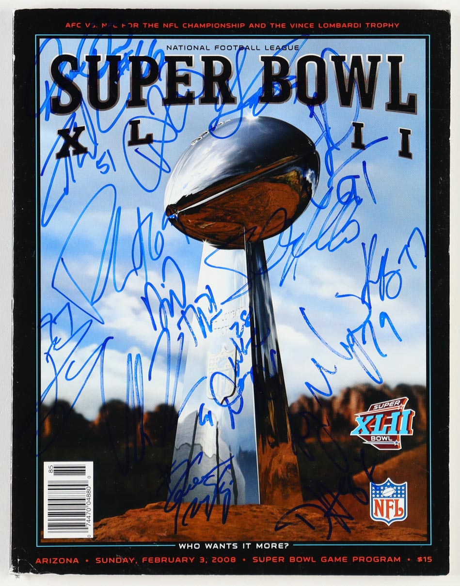 Super Bowl XLII program has been hand-signed by (15) members of the 2007-08 New York Giants including Brandon Jacobs, David Diehl, Rich Seubert, Kevin Boothe, Guy Whimper, Adam Koets, Gibril Wilson, Zak DeOssie, Justin Tuck and (6) others. Please note some of the signatures are fading.