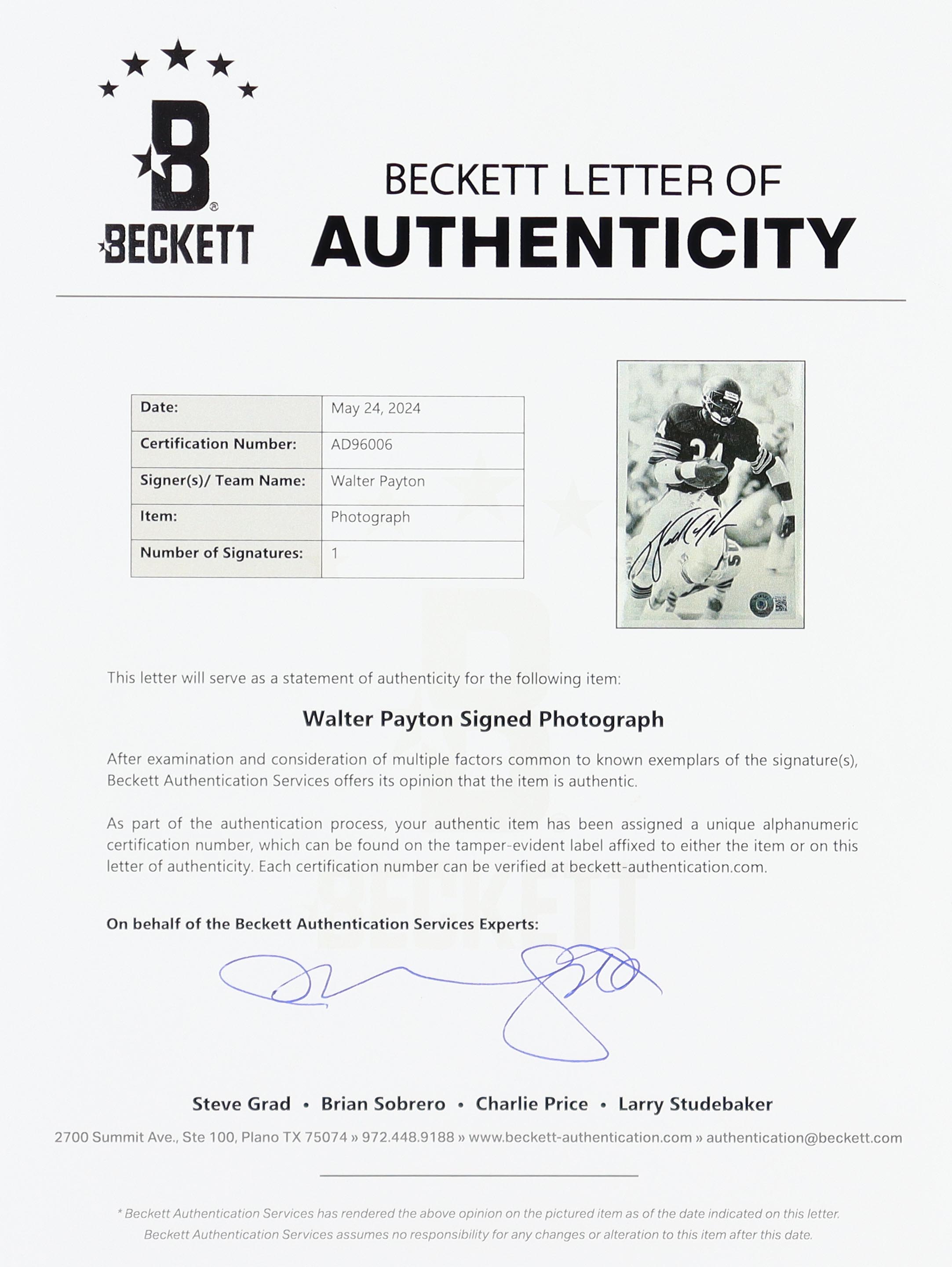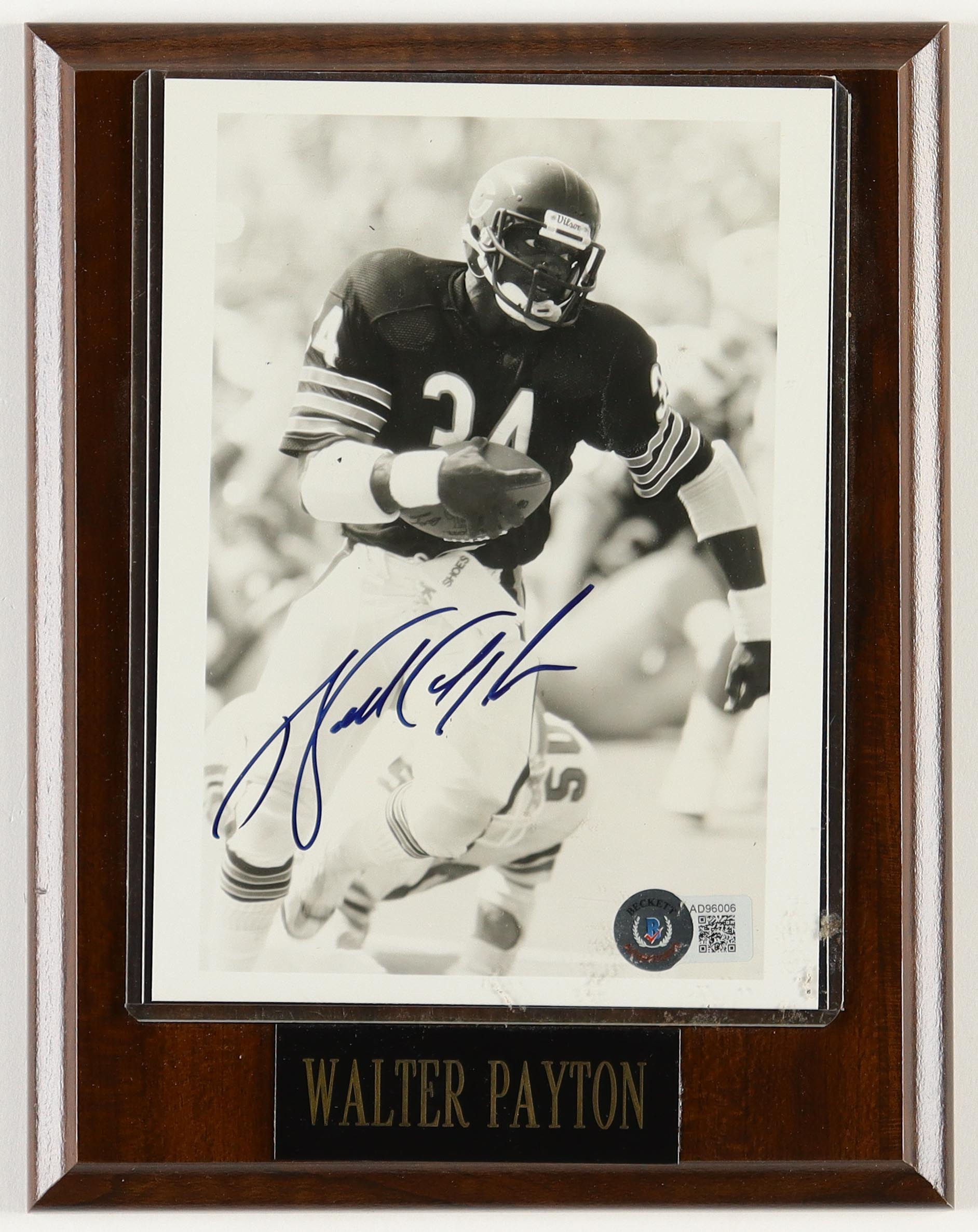 Display measures approximately 7" x 9" in size. The plaque features a photo that has been hand-signed by Walter Payton (D. 1999, Chicago Bears, HOF). Please note, there is scuffing and small chipping on the plaque.