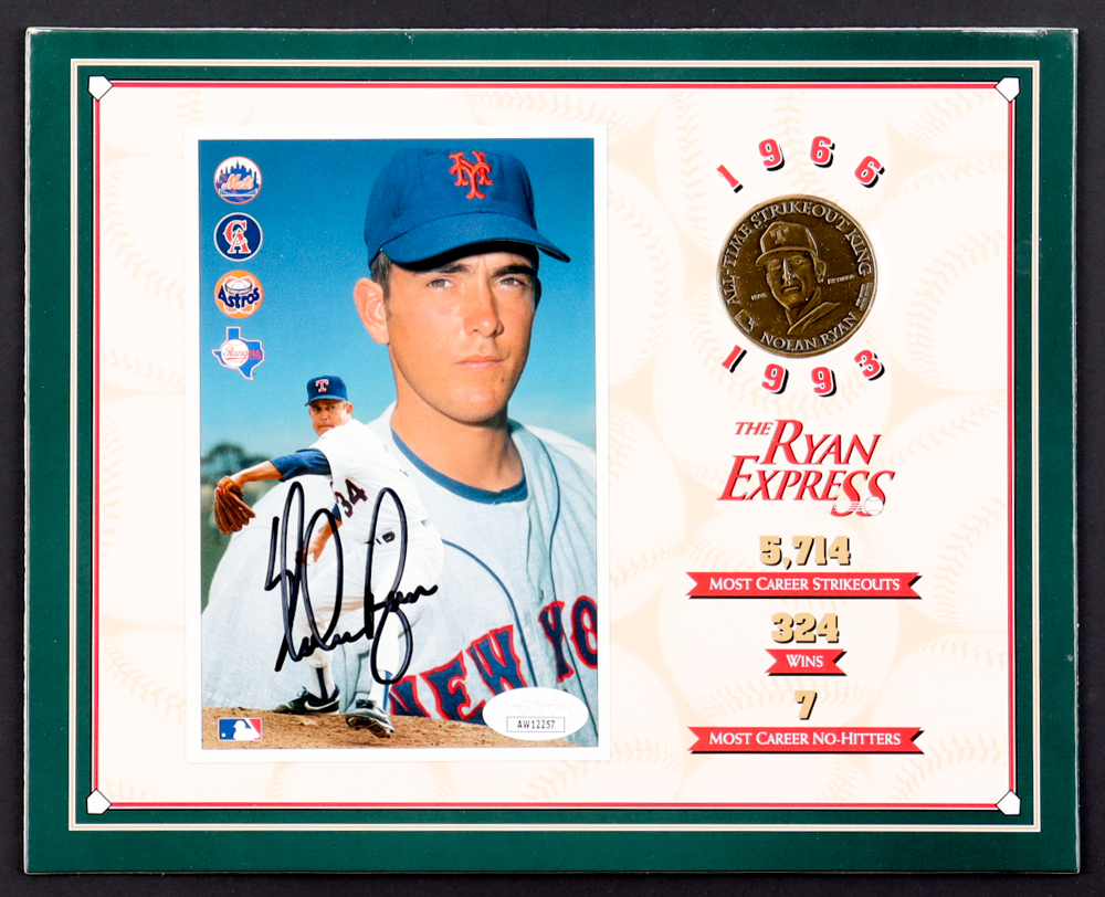 Plaque measures 8" x 10" in size and has been hand-signed by Nolan Ryan (New York Mets, HOF).