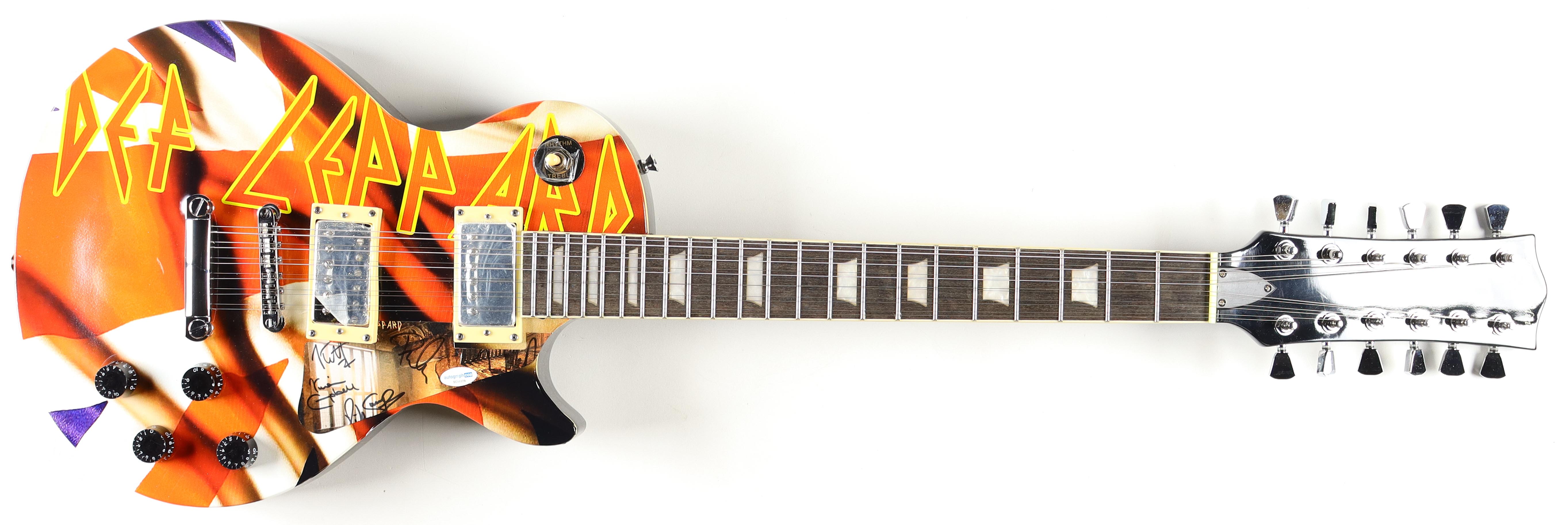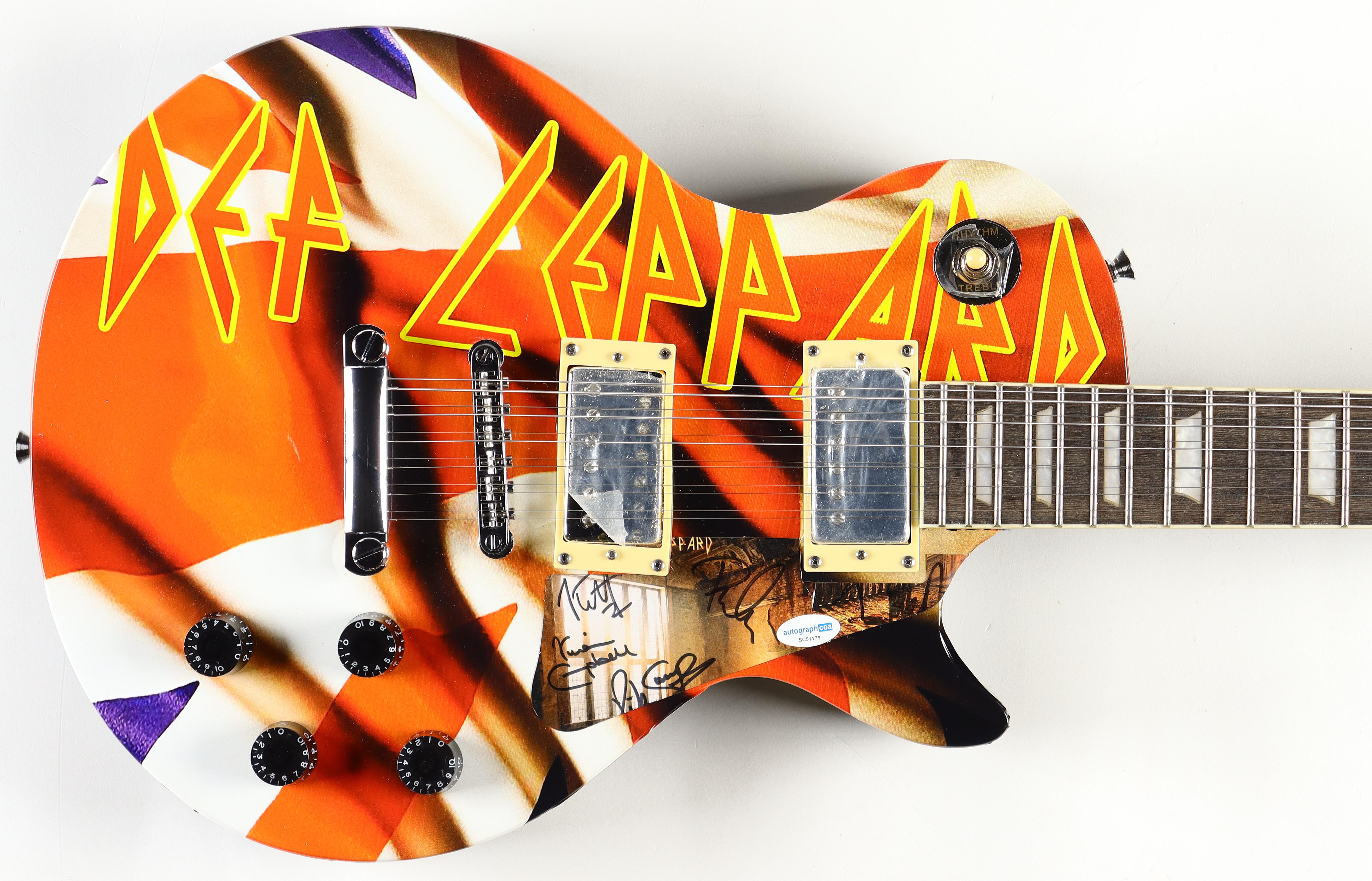 Full-size 41" authentic electric guitar hand-signed on the pickguard by (5) members of Def Leppard! Signers include Joe Elliott, Phil Collen, Rick Allen, Rick Savage, and Vivian Campbell!