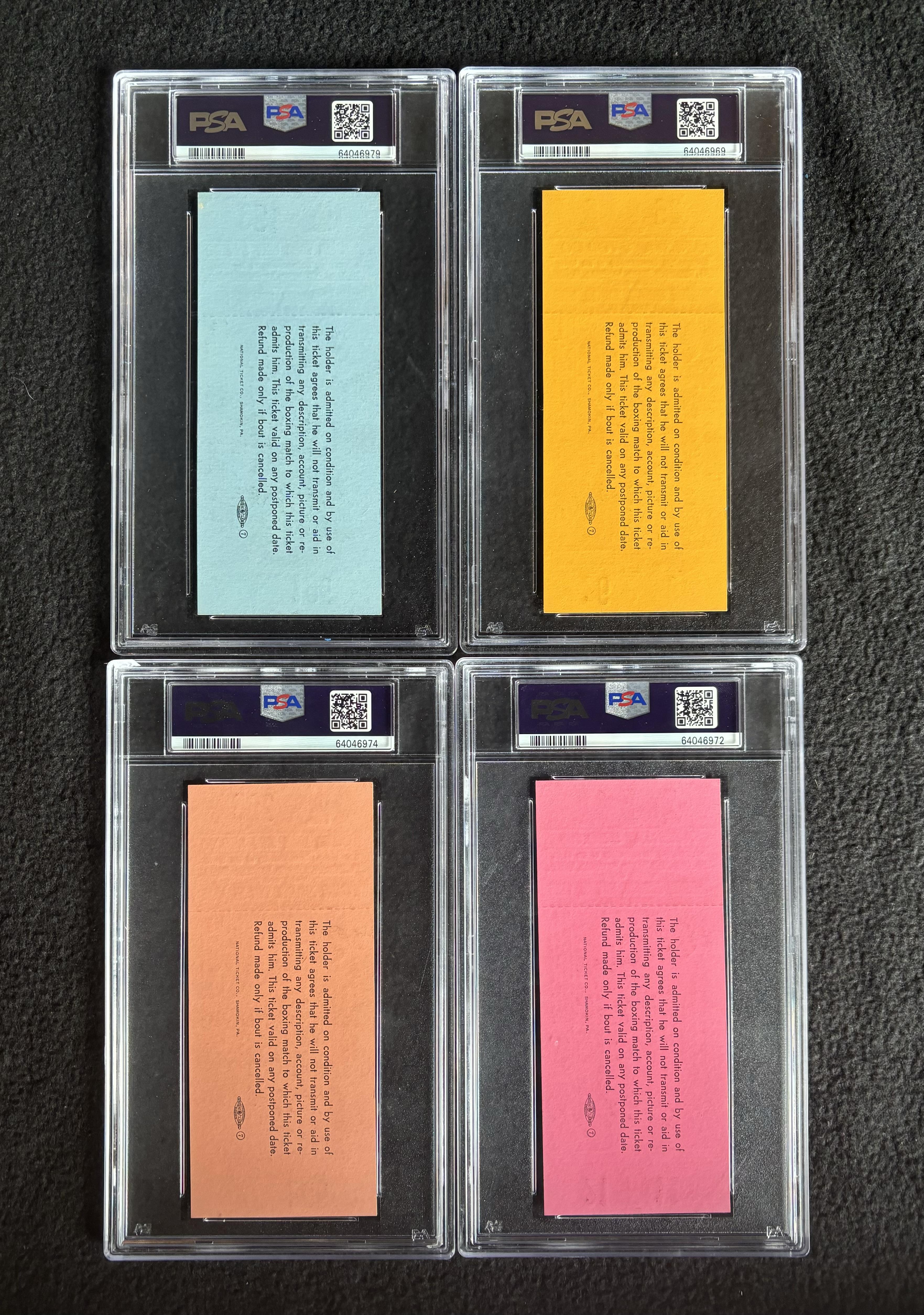 Set of (4) tickets dated May 25, 1965 for the Muhammad Ali vs Sonny Liston boxing match. Each ticket has been individually graded and encapsulated by PSA. Blue Variation has been graded a PSA 8, gold PSA 7, pink and orange each graded a PSA 6.