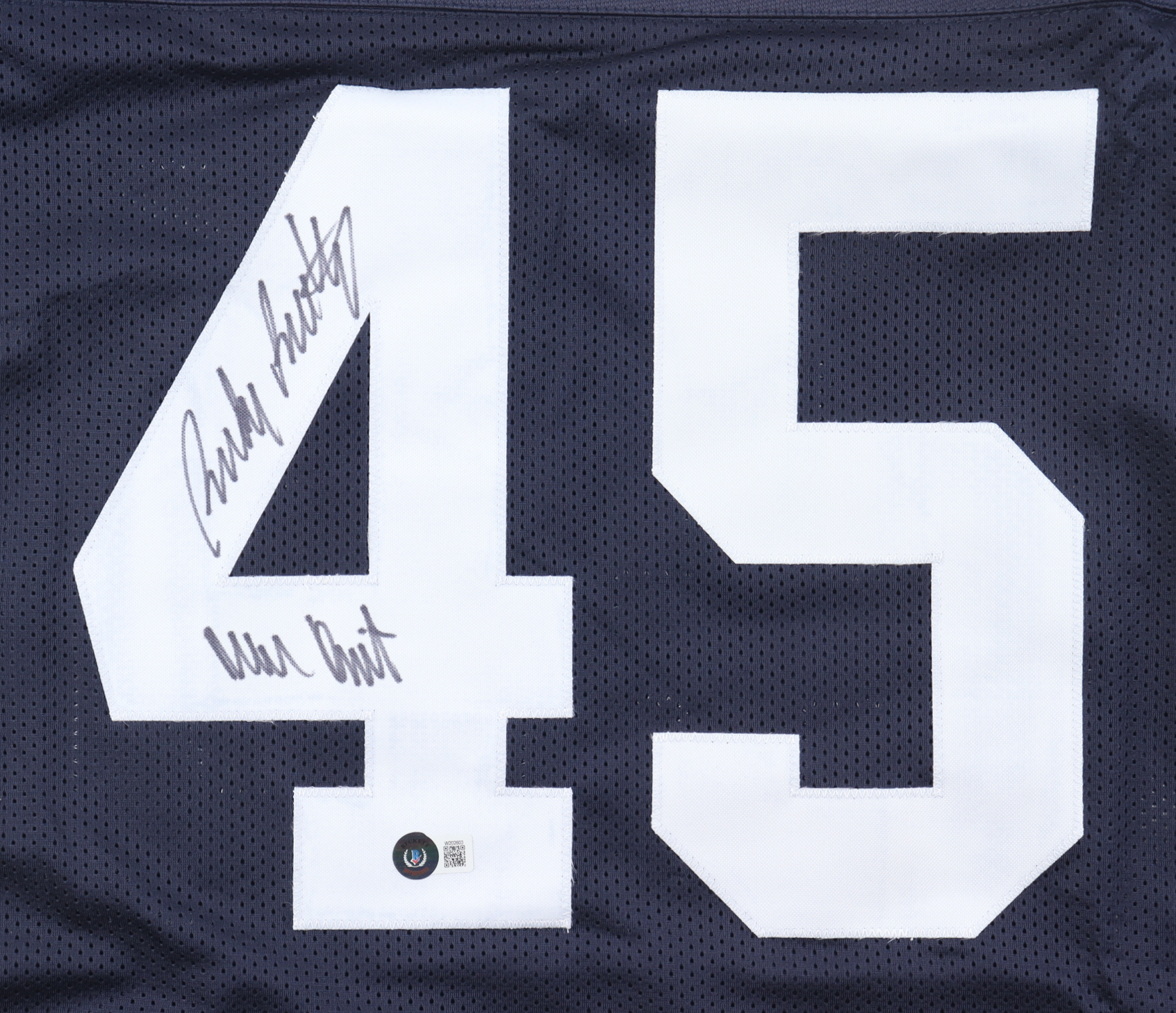 Custom jersey with everything sewn on, size XL. Hand-signed and inscribed by Rudy Ruettiger. Please note, glue is visible through the front and reverse numbers.