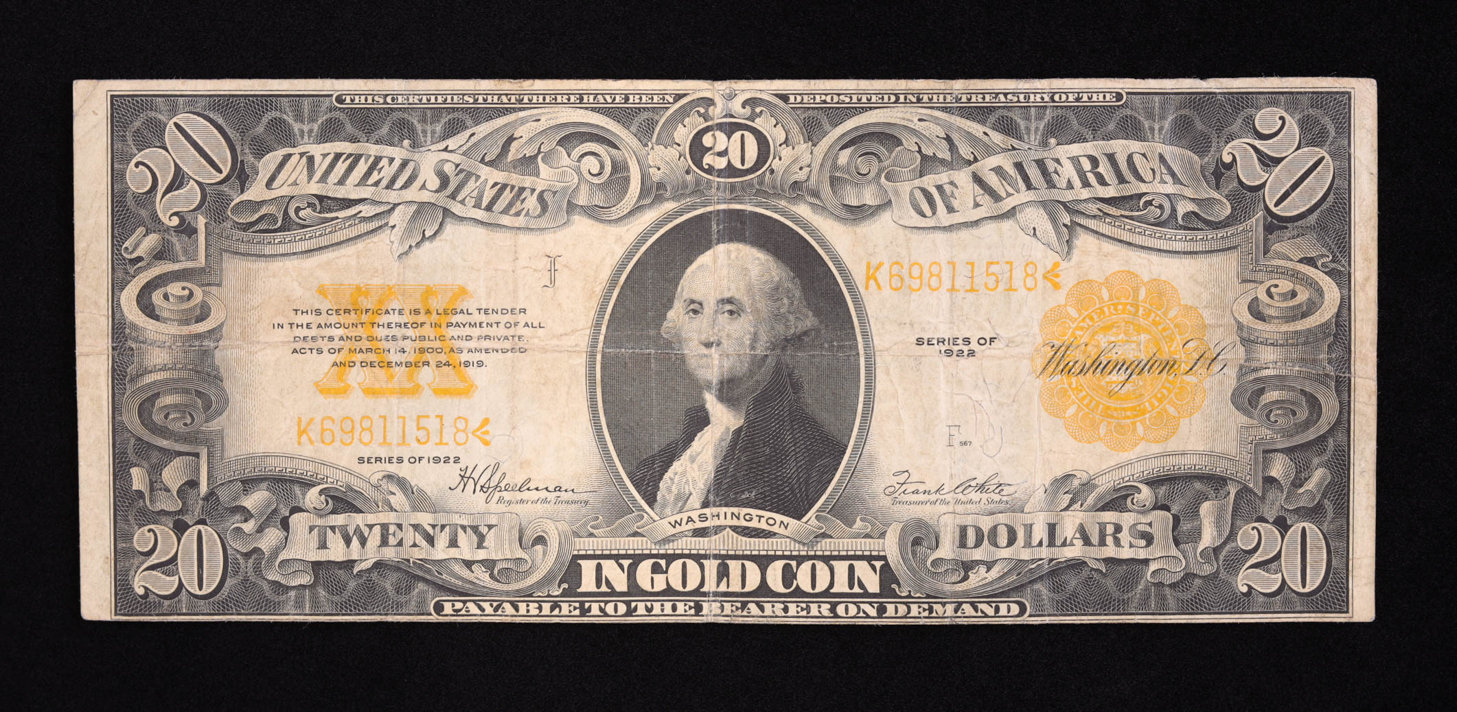 1922 United States $20 Twenty Dollar Gold Certificate Banknote