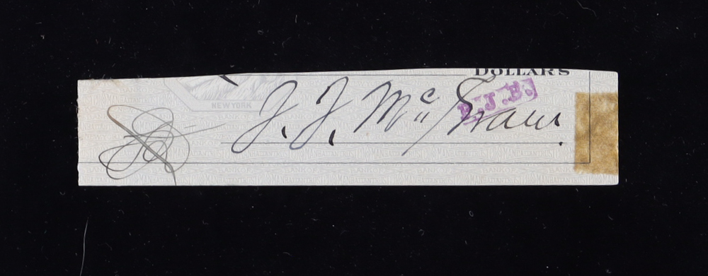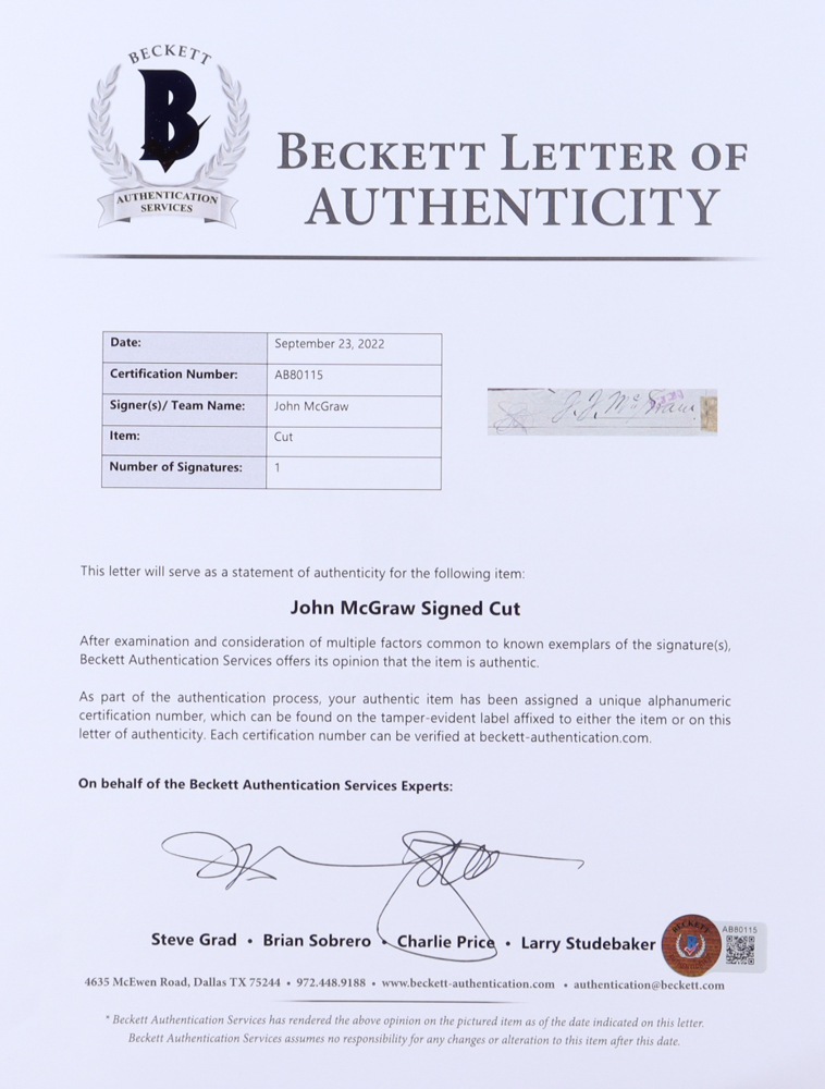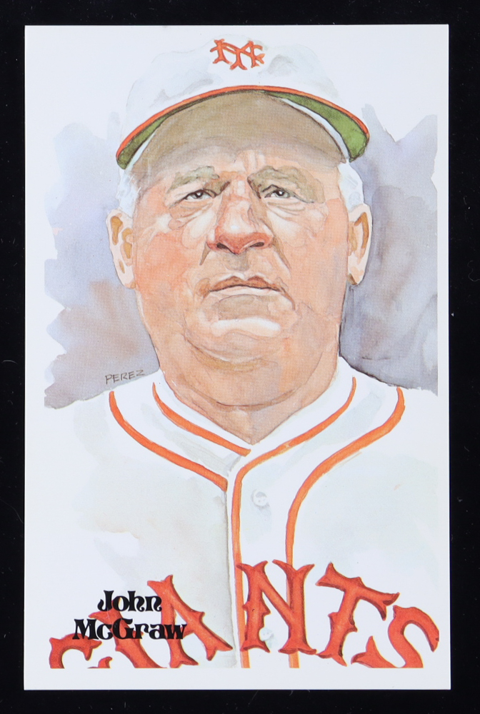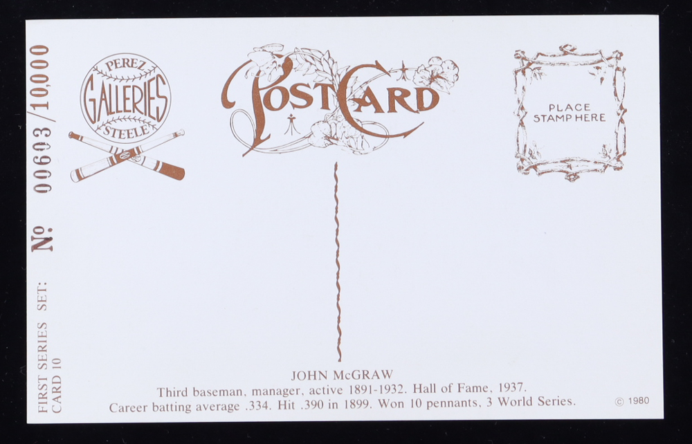 Cut measures approximately 1" x 4.25" and has been hand-signed by John McGraw (D. 1934, New York Giants, HOF). Also included is an unsigned limited edition 1980 Perez-Steele Postcard #10 and is numbered #6616/10,000. Please see photos for more details regarding the condition of the cut and postcard.