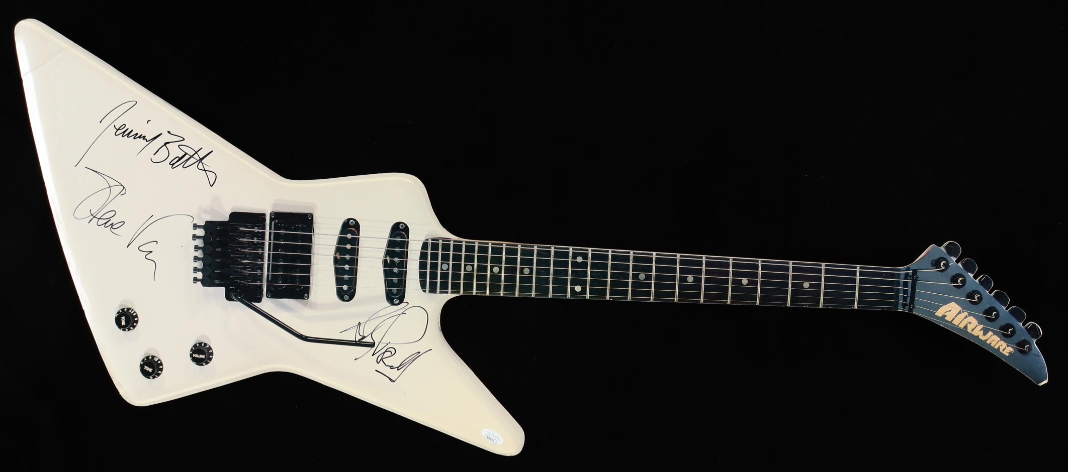 Airware Cardboard Cut Out Guitar measures approximately 40" in length and has been hand-signed by Steve Vai, Andy Powell (Wishbone Ash) and Jennifer Batten (Michael Jackson & Jeff Beck Guitarist) .