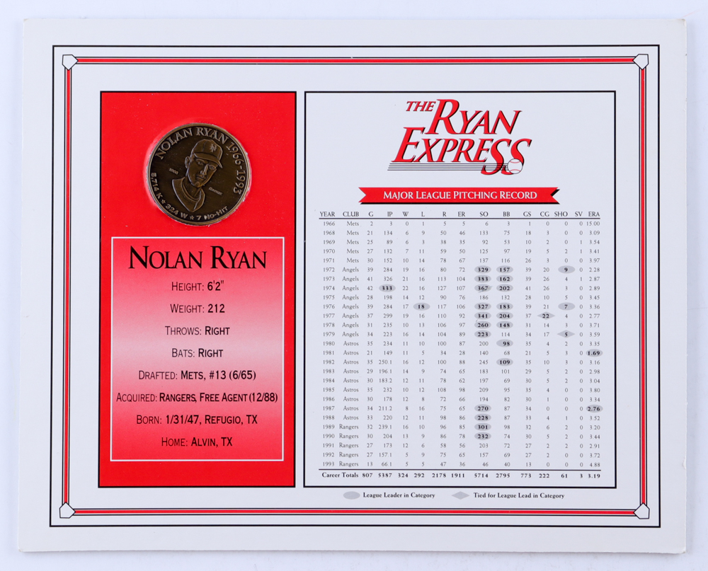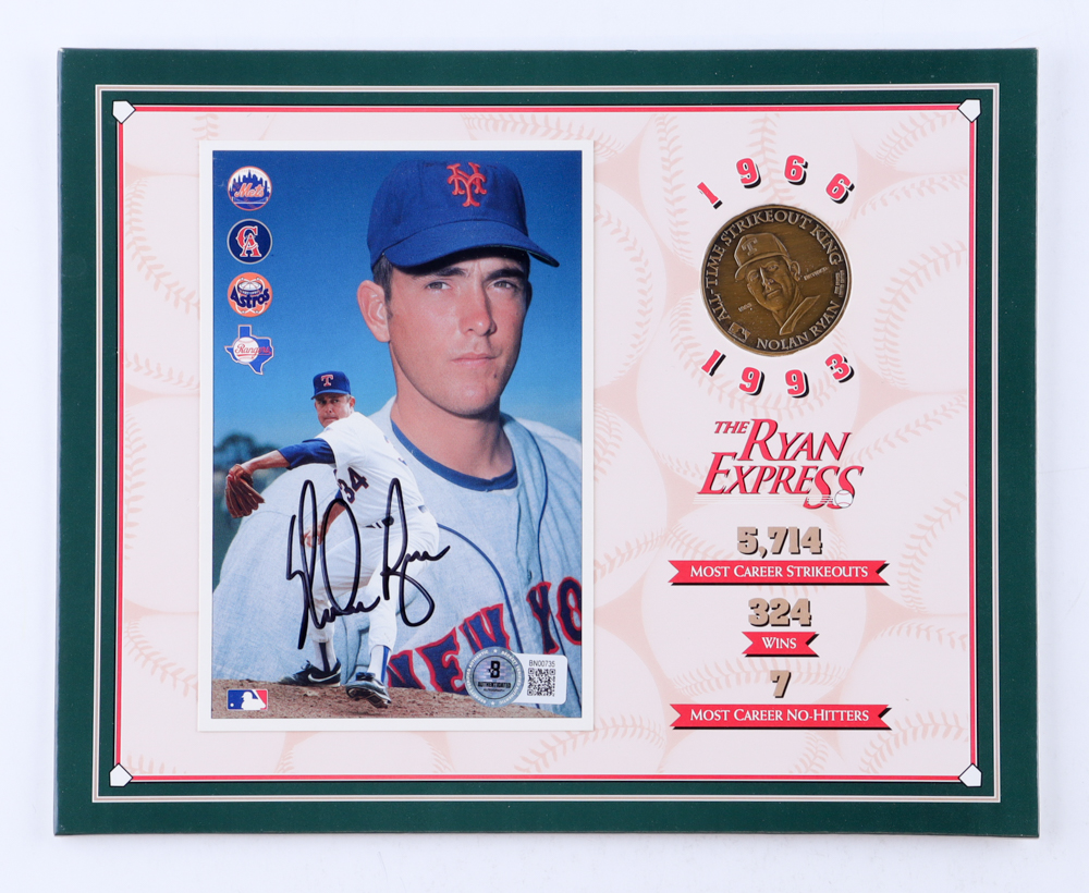 Matting measures 8" x 10" in size. Features a photo that has been hand-signed by Nolan Ryan (New York Mets, HOF). Includes coin.