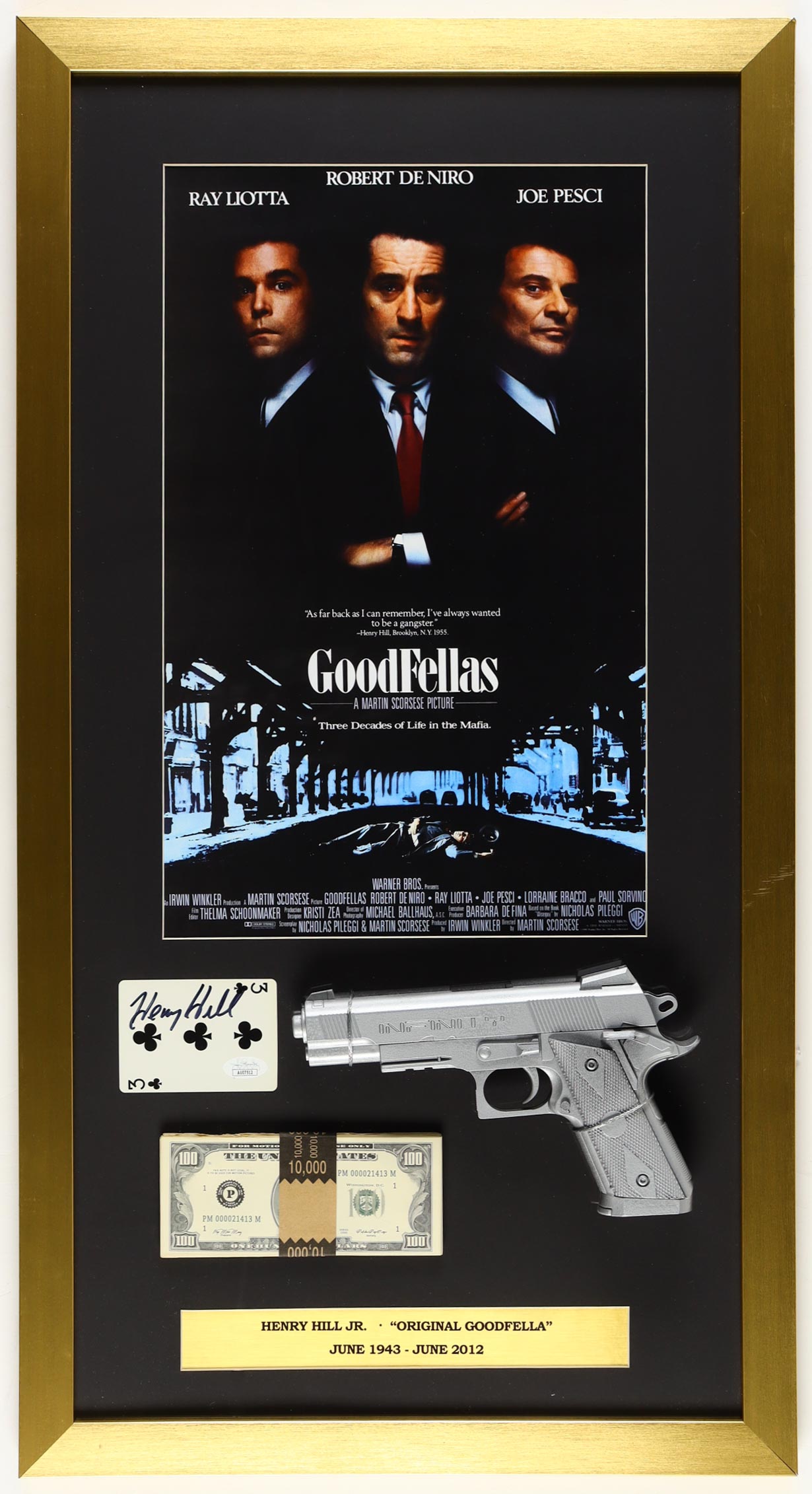 Henry Hill Signed "Goodfellas" Custom Framed Playing Card Display with Poster Print, Prop Money Stack & Replica Prop Pistol (JSA)