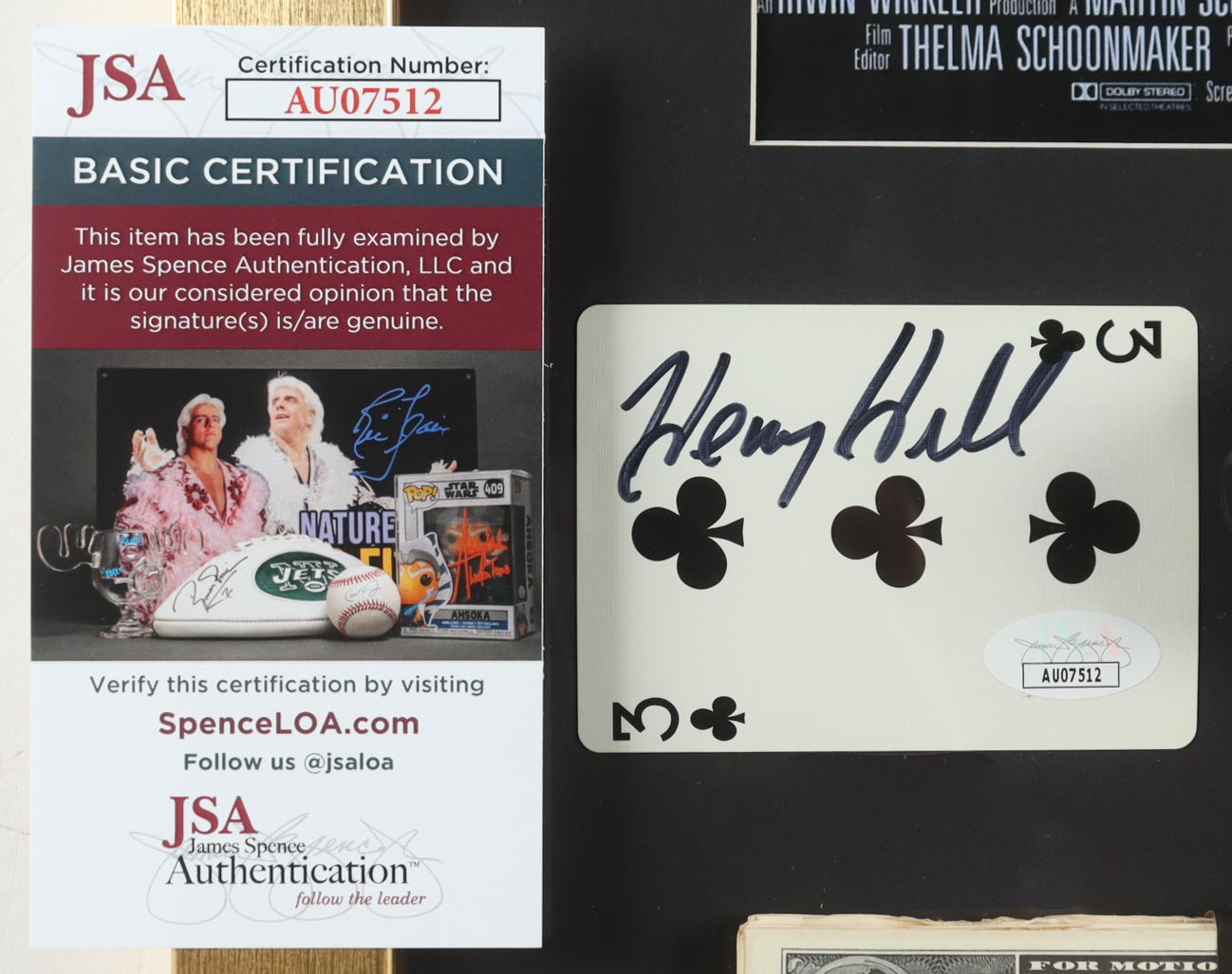 Custom frame measures approximately 17" x 32" in size and features a playing card that has been hand-signed by Henry Hill (D. 2012). Display also features movie poster print, prop money stack and replica prop pistol.