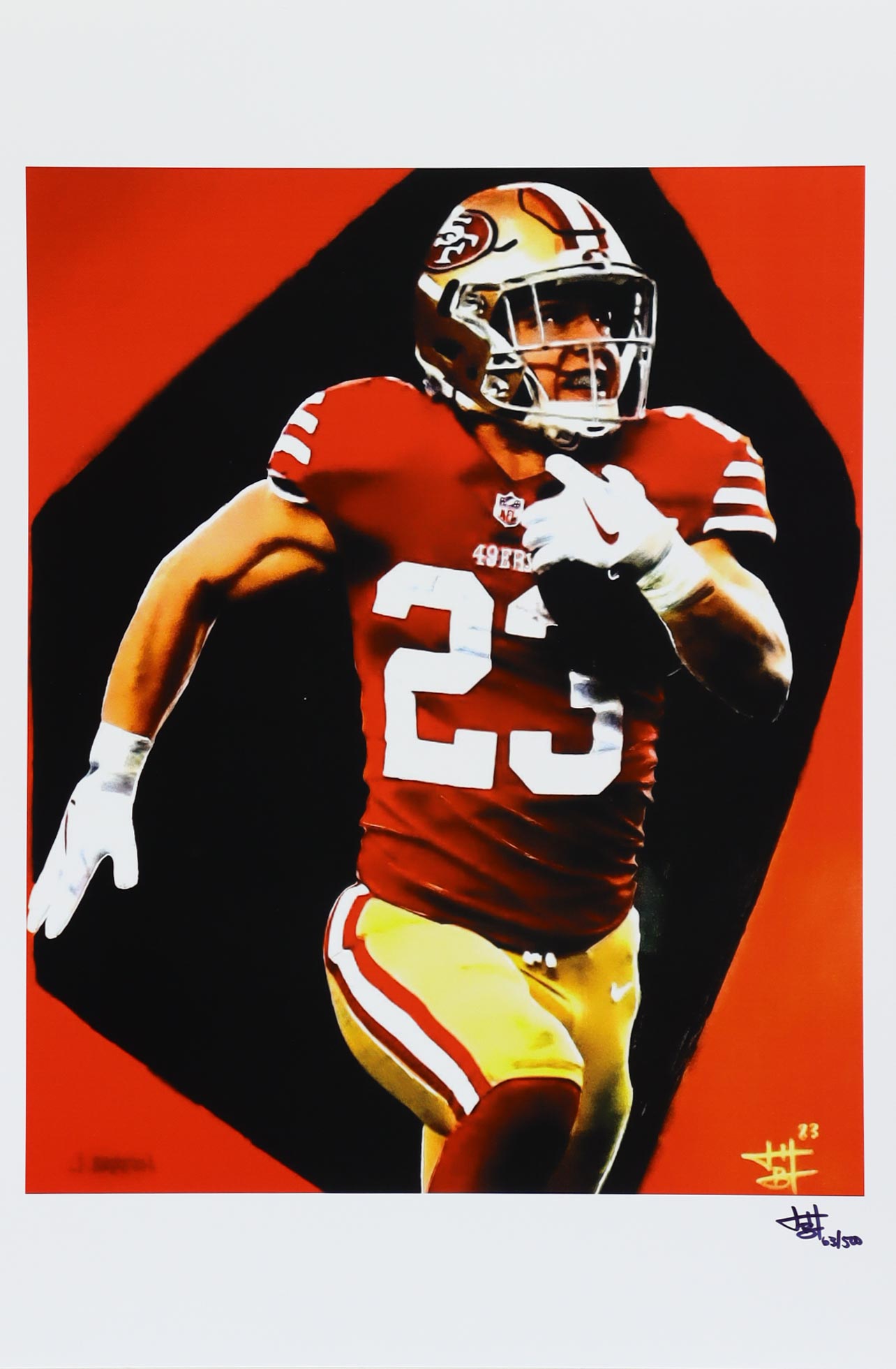 This limited edition giclee on high-quality matte fine art smooth 230gsm paper measures approximately 12" x 18" in size. The piece is hand-signed and numbered by the artist, Joshua Barton and features Christian McCaffrey (San Francisco 49ers).