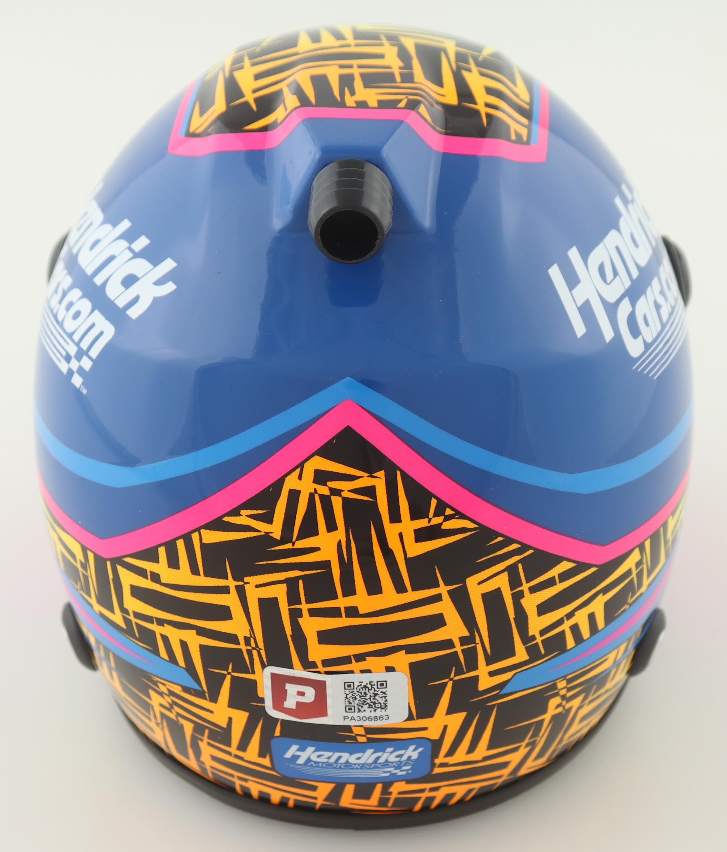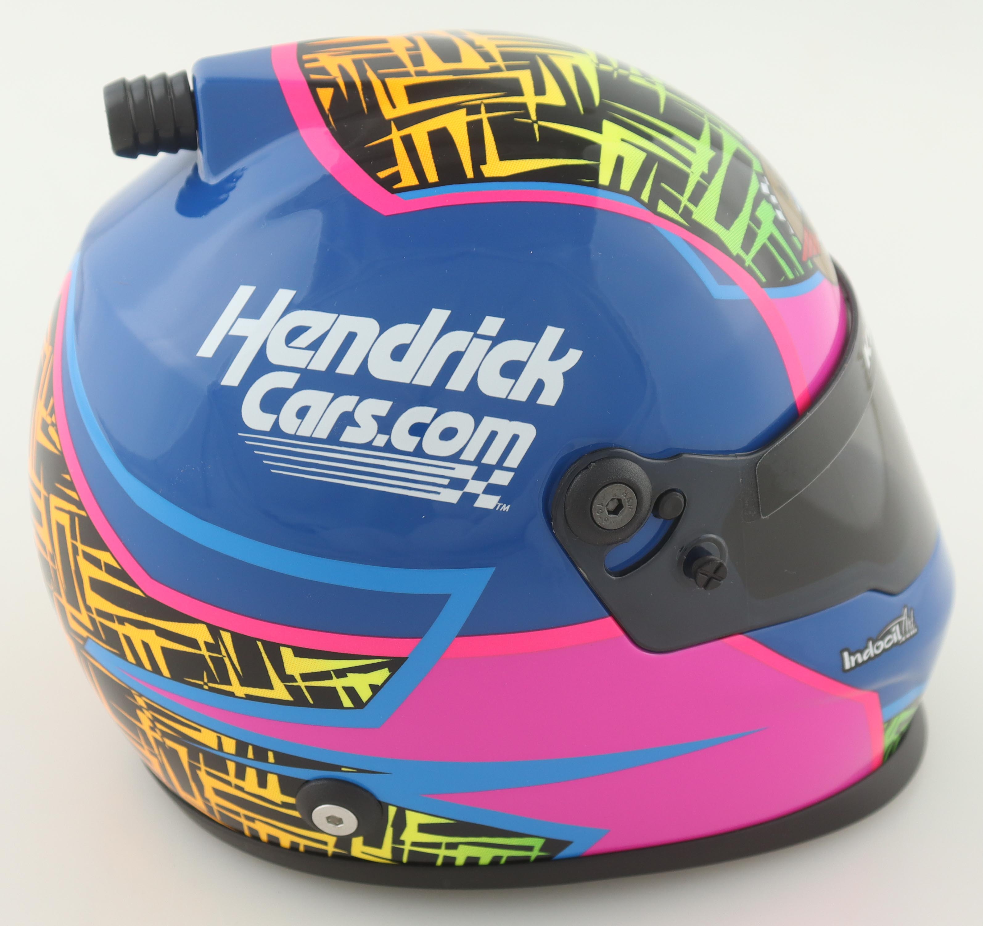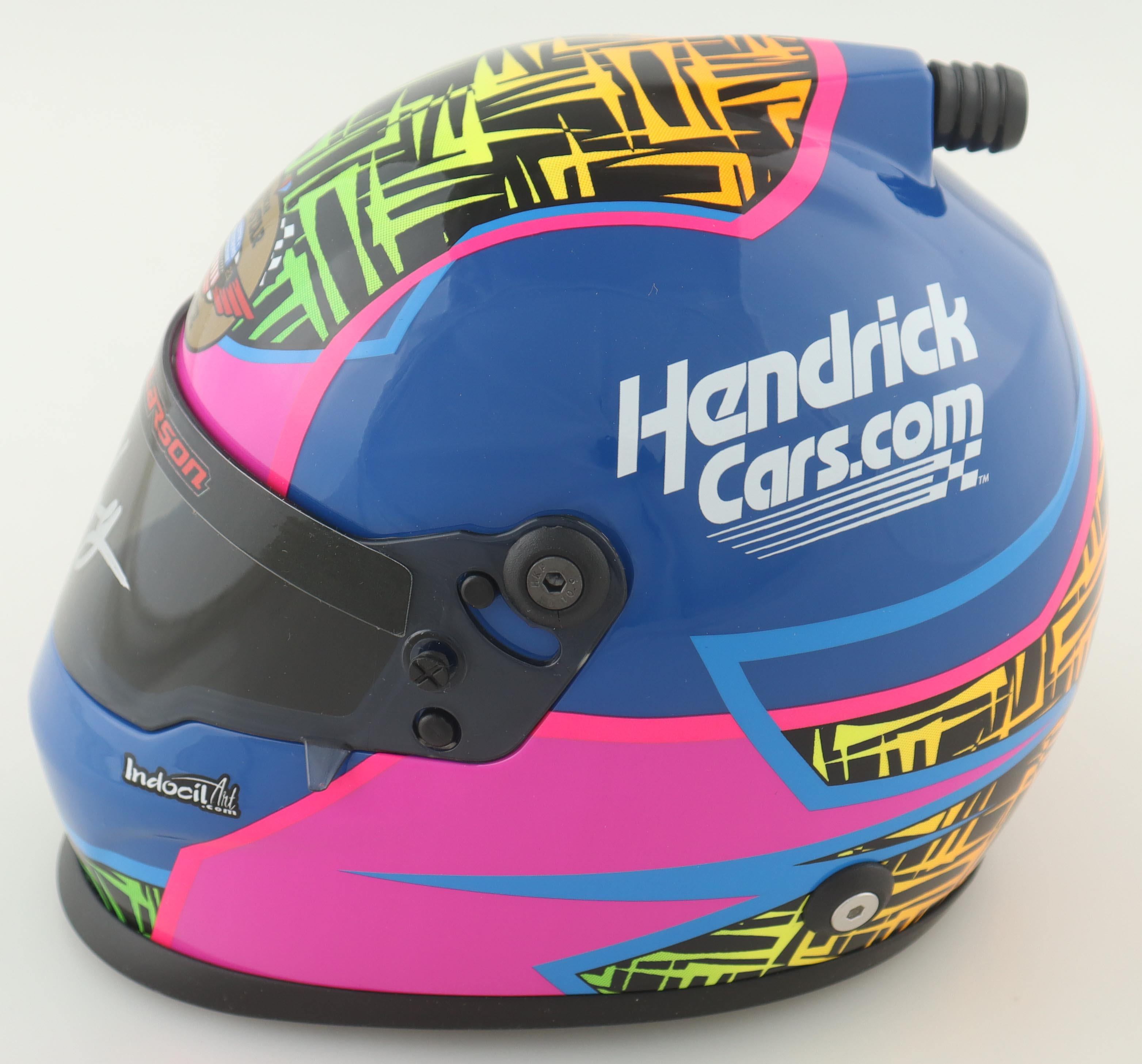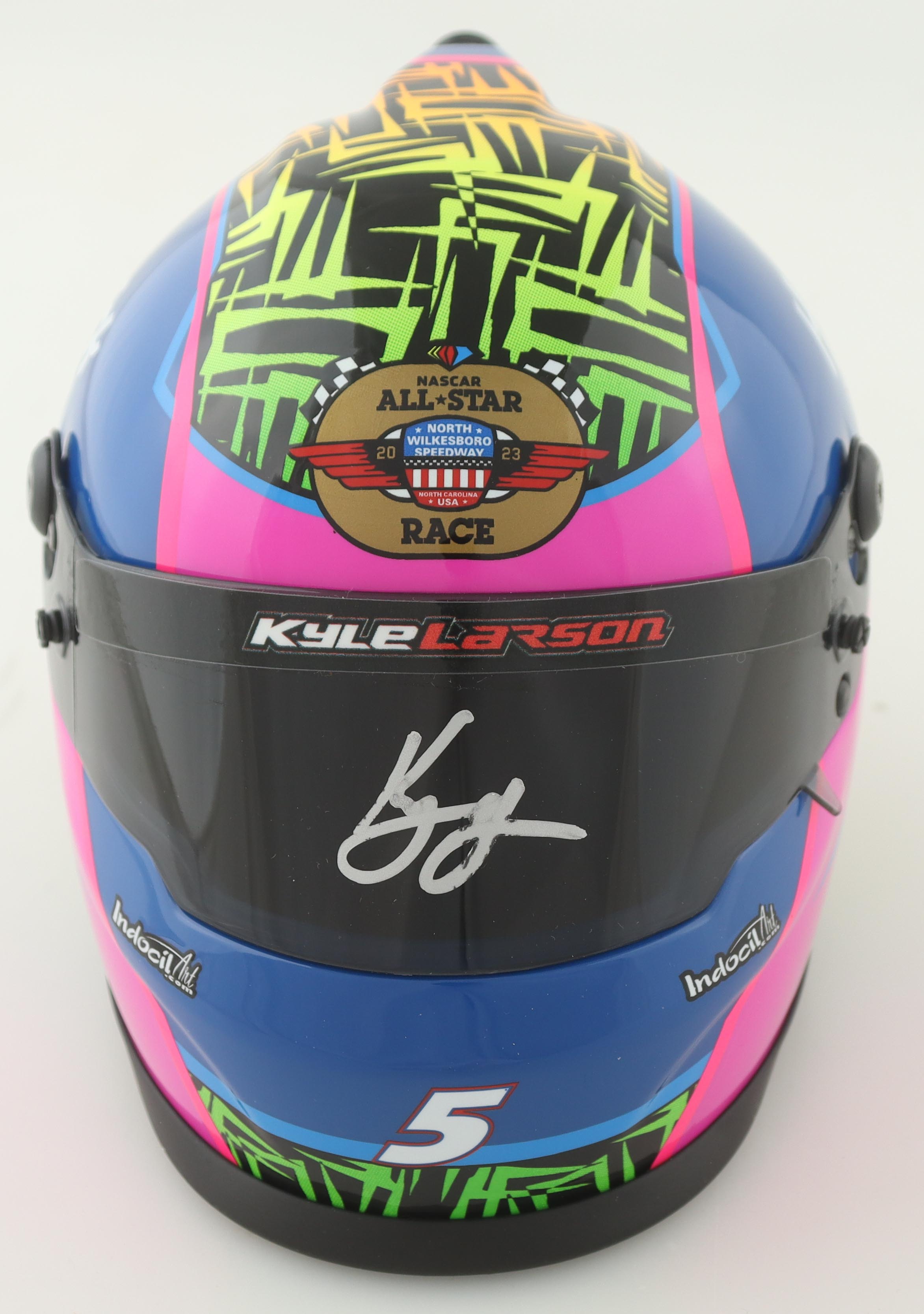 NASCAR 2023 North Wilkseboro All-Star Race I Hendricks.com Mini Helmet is hand-signed on the visor by Kyle Larson. Please note, the autograph is imperfect.