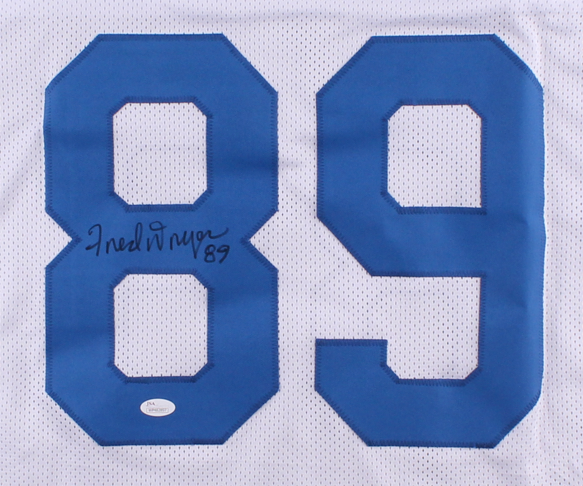 Custom on-field style throwback jersey. Everything is sewn on, size XL. Hand-signed in black felt-tip pen by Fred Dryer.