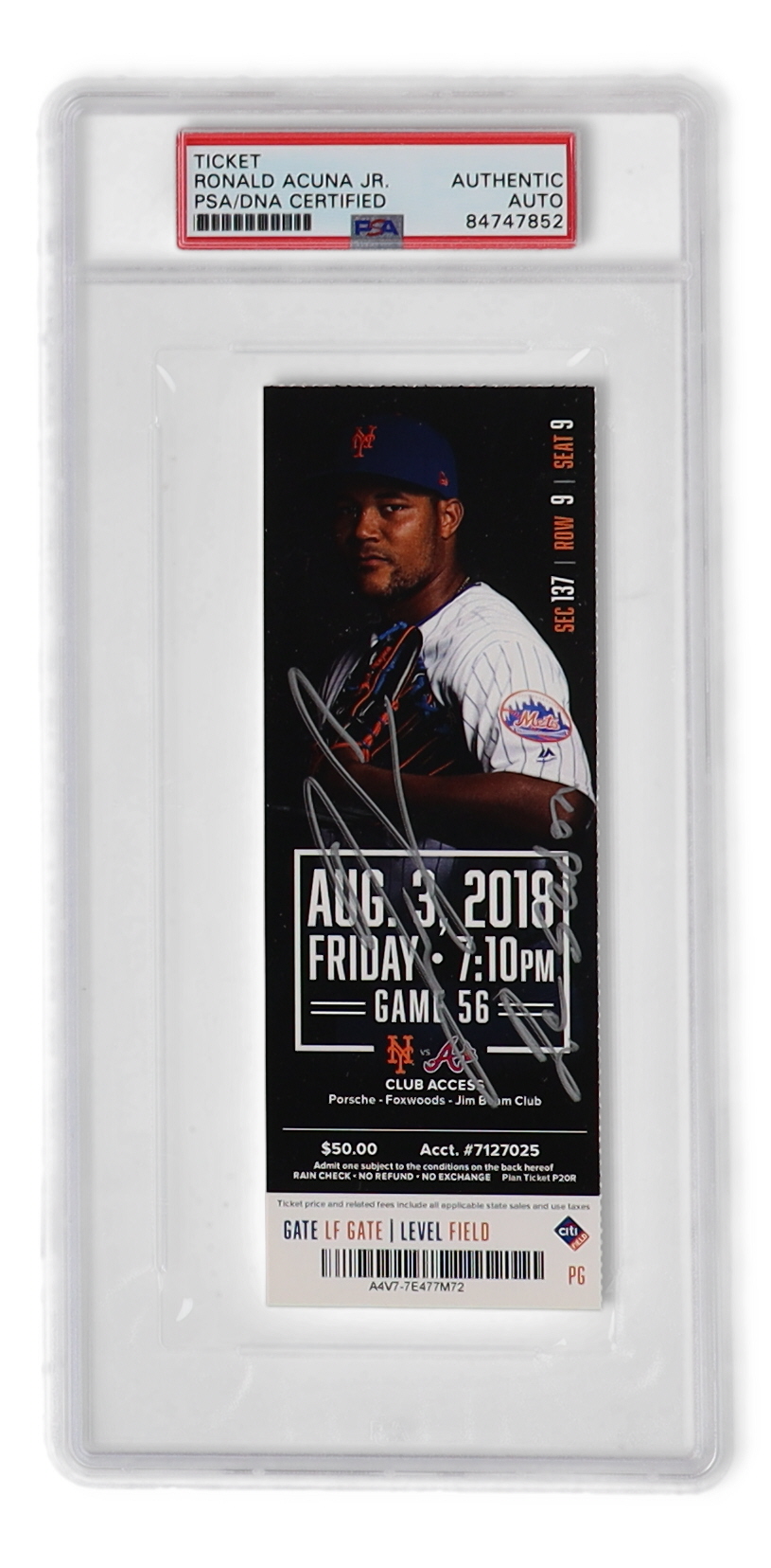 August 3rd, 2018 Atlanta Braves vs New York Mets game ticket. Hand-signed and inscribed by Ronald Acuna Jr. (Atlanta Braves).