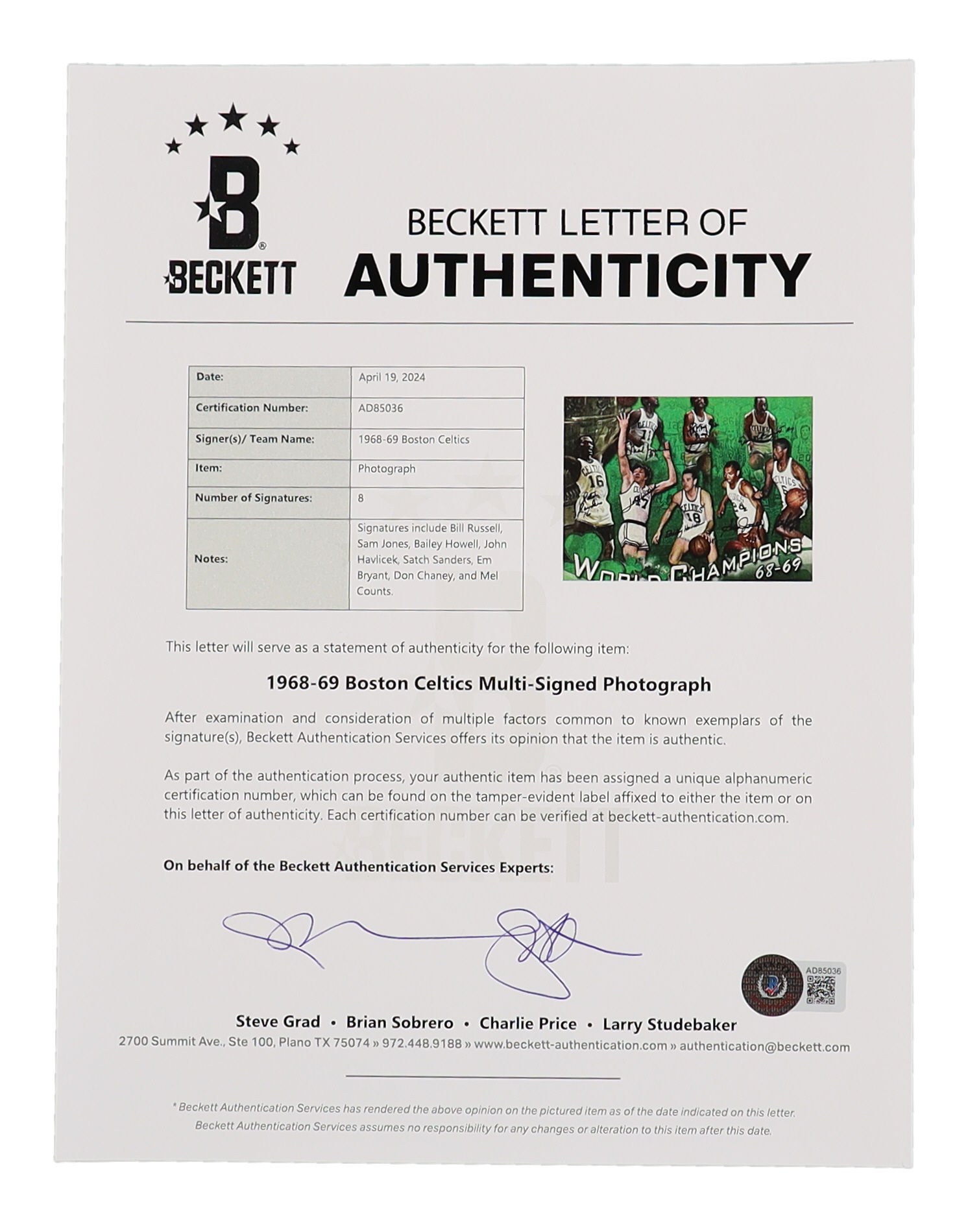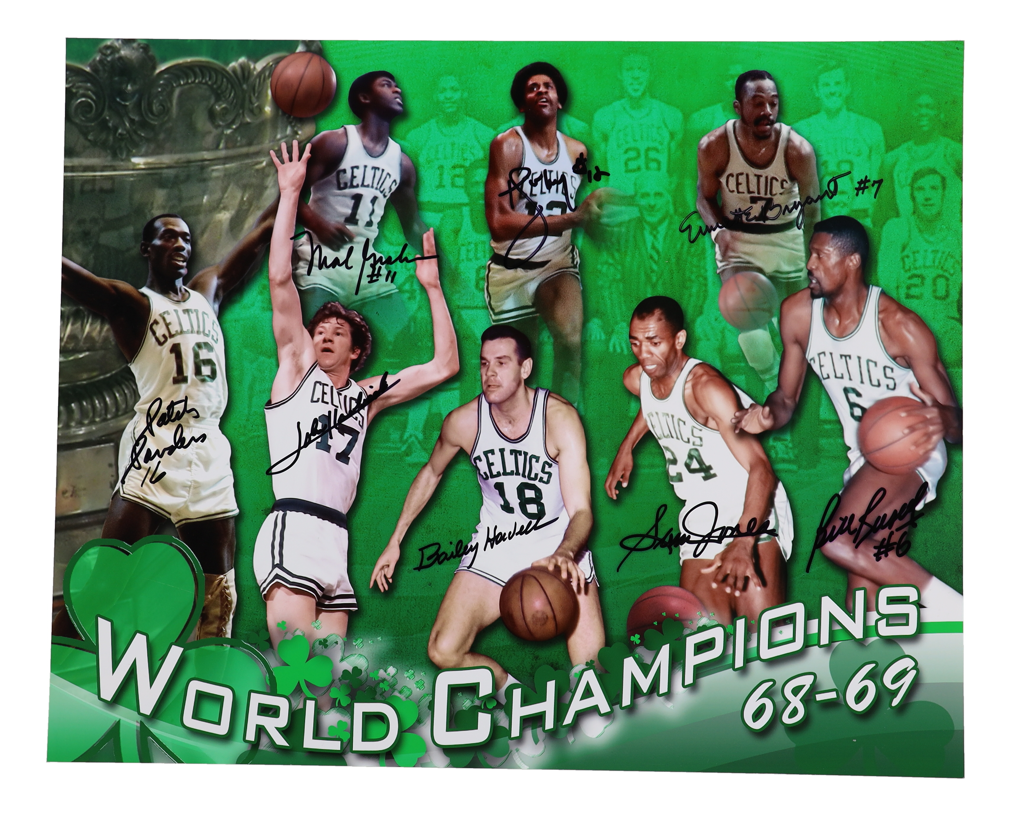 Photo measures 16" x 20" in size. Hand-signed by (8) 1968-69 Boston Celtics with Bill Russell, Sam Jones, Bailey Howell, John Havlicek, Satch Sanders, Em Bryant, Don Chaney and Mel Counts.