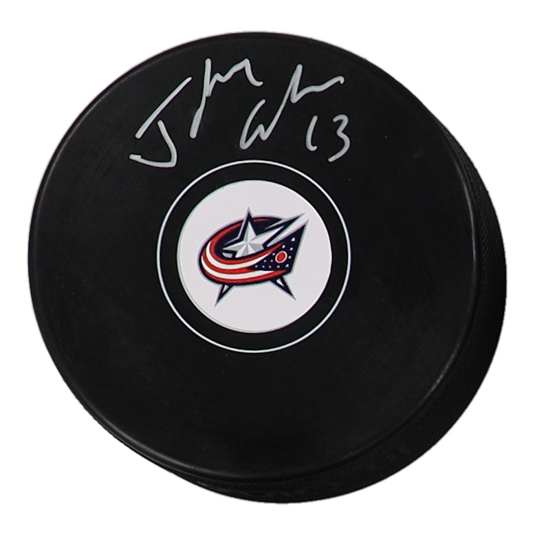 Columbus Blue Jackets Logo hockey puck. Hand-signed by Johnny Gaudreau.