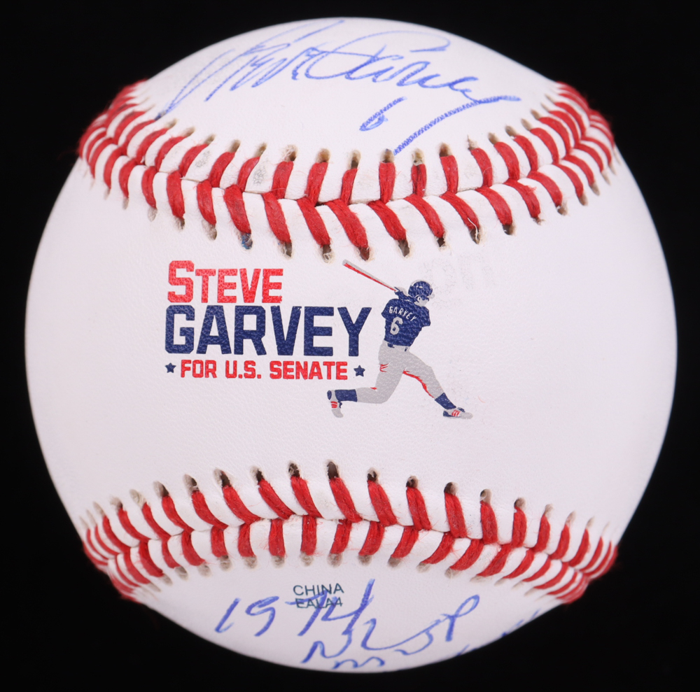 Rawlings Official League "Steve Garvey For U.S. Senate" Logo baseball. Hand-signed and inscribed by Steve Garvey (Los Angeles Dodgers).