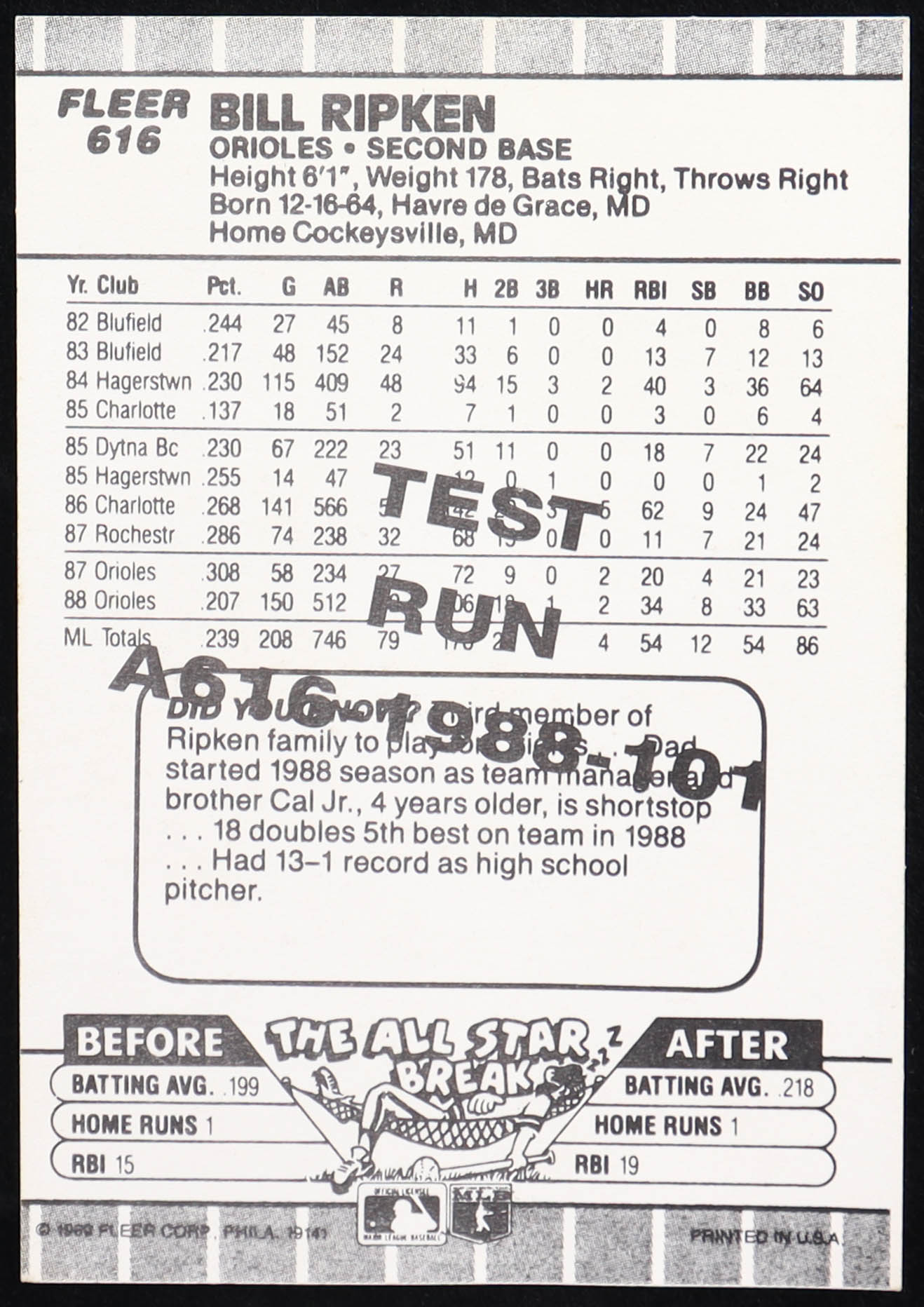 Bill Ripken 1989 Fleer #616 Test Run / F*** Face Written on Knob of Bat