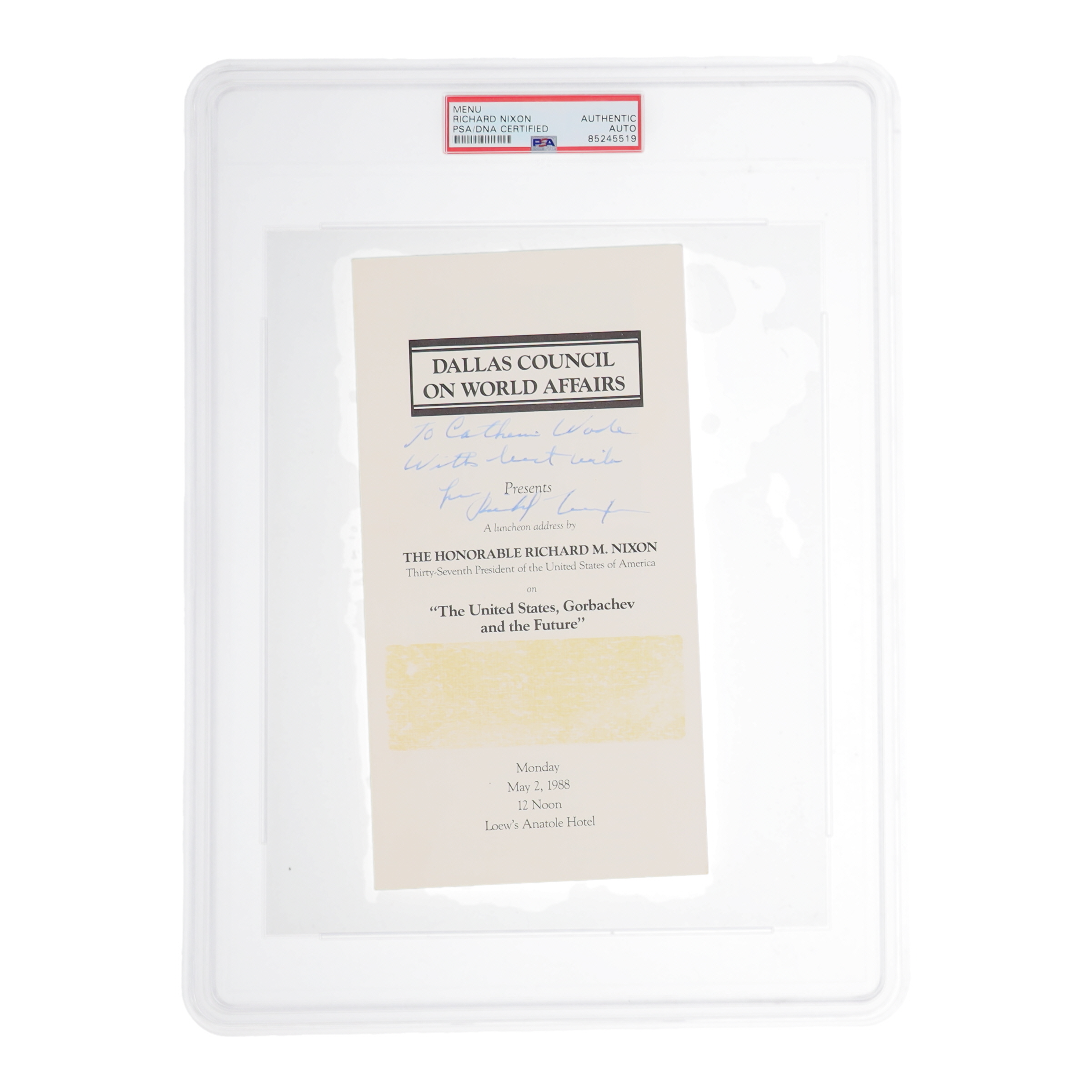 Menu measures 4.5" x 8.5" in size. Hand-signed and inscribed by Richard Nixon (D. 1994). Please note, the inscription has been personalized to "Catherine". Refer to photos for more details on the condition of the item.