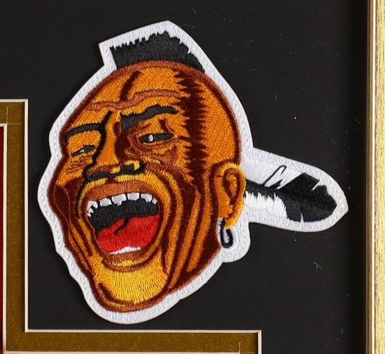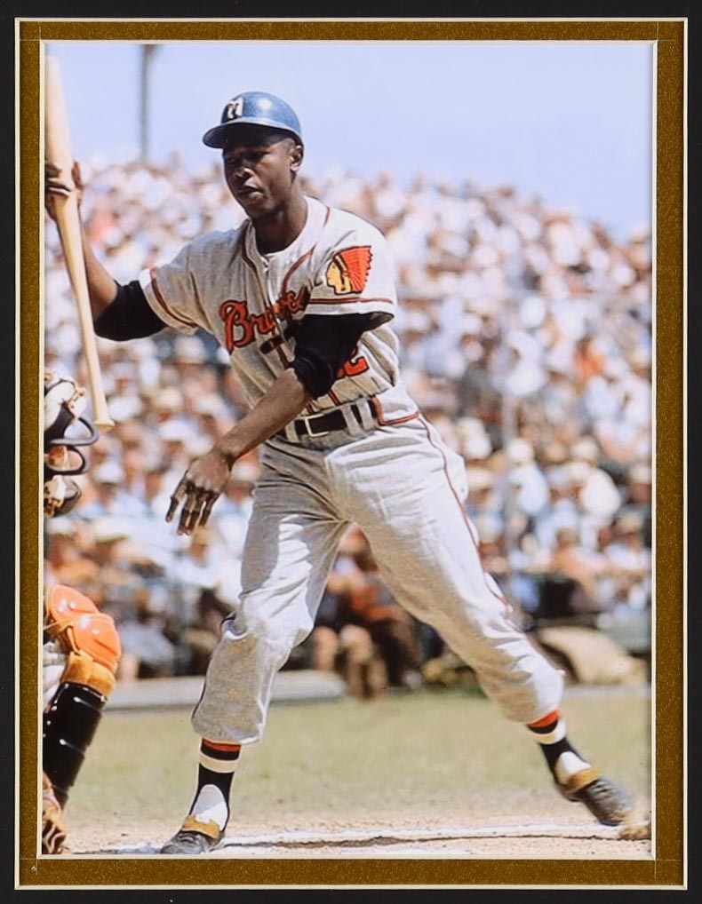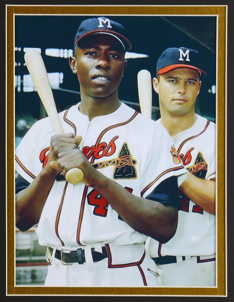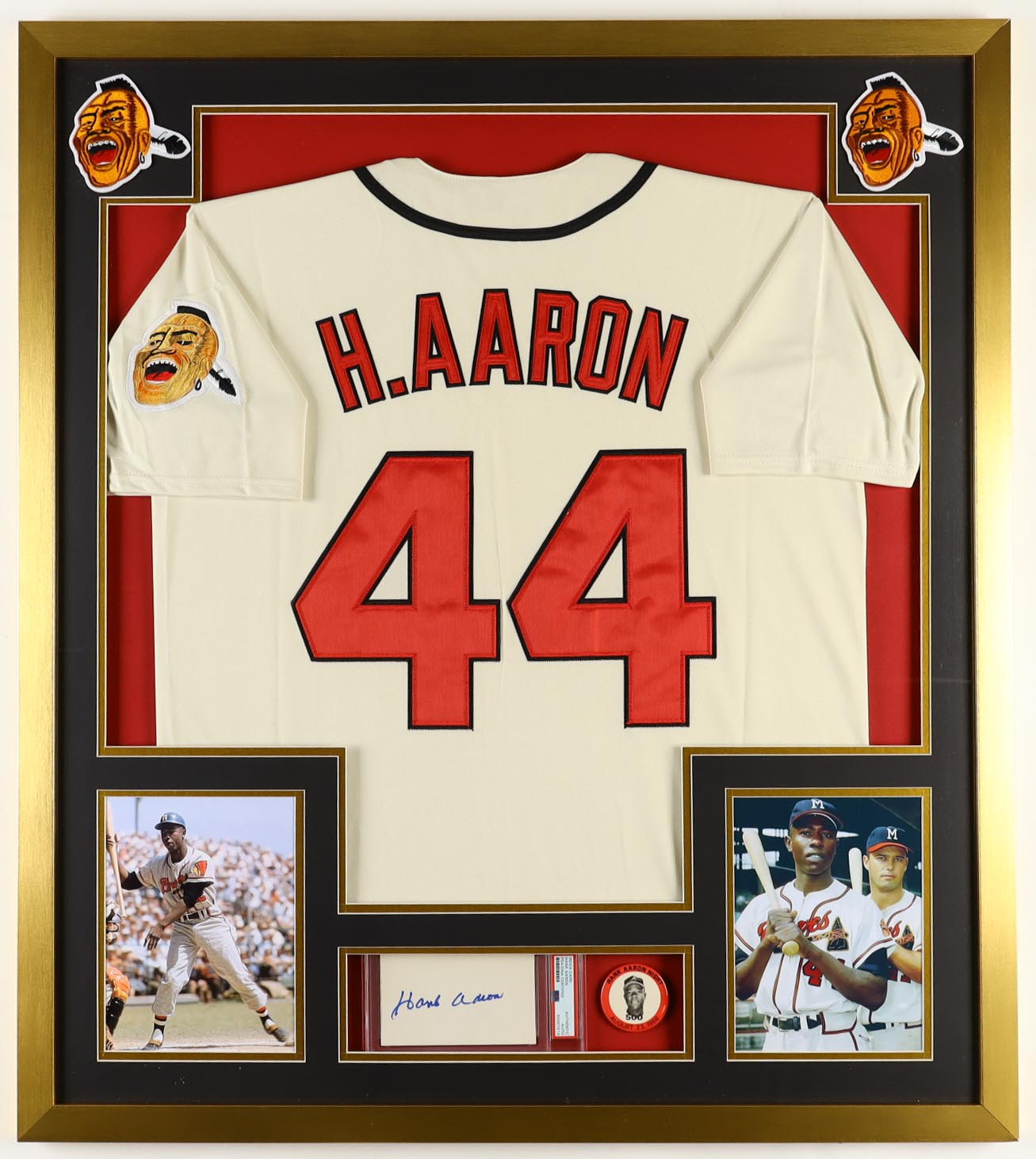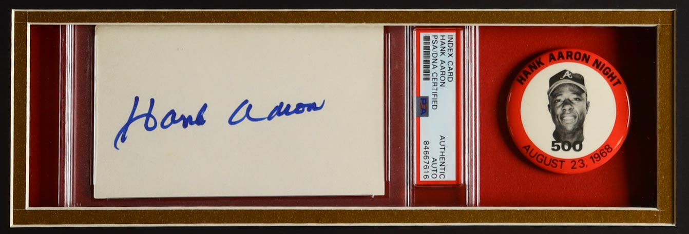 Custom frame measures approximately 32" x 36" in size and features a cut that has been hand-signed by Hank Aaron (D. 2021, Atlanta Braves, HOF). The display also includes a custom unsigned jersey as well as (2) photos, (2) cloth patches and a vintage Hank Aaron Night photo pin.