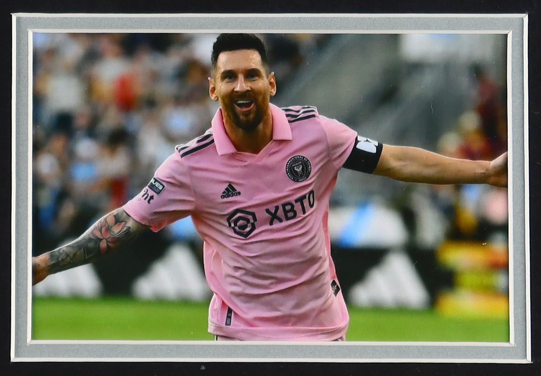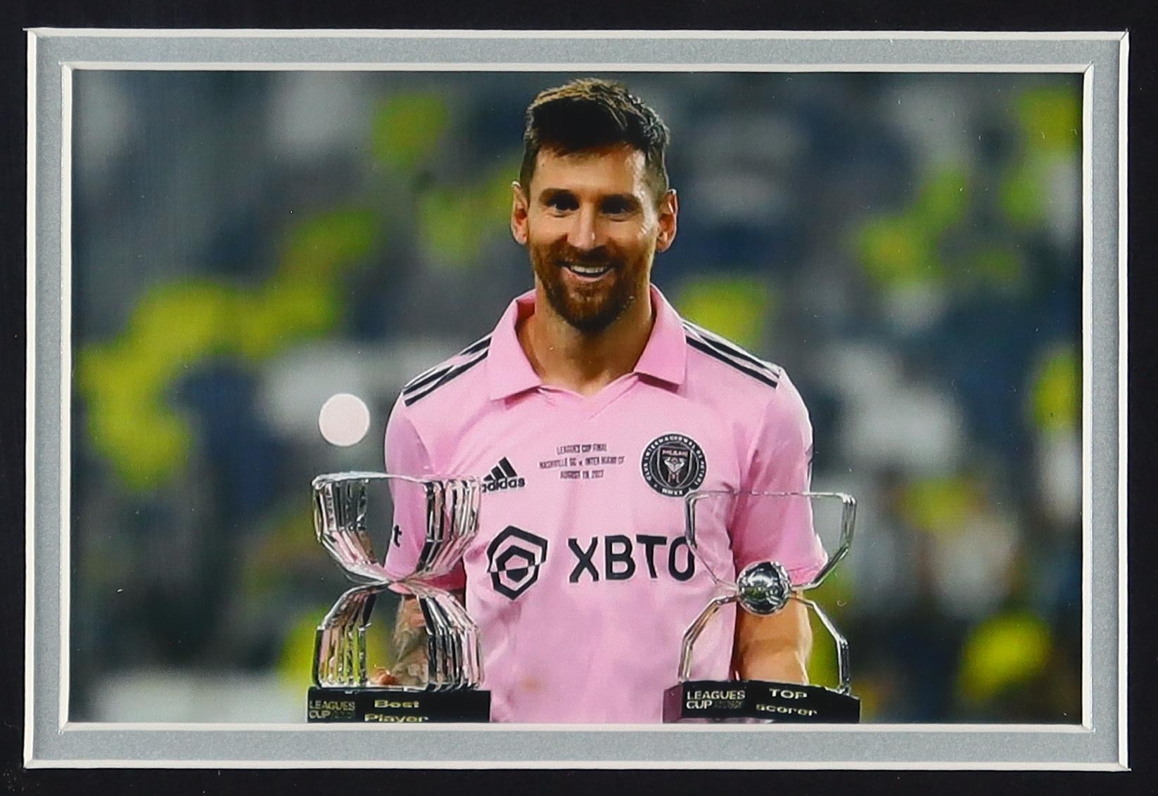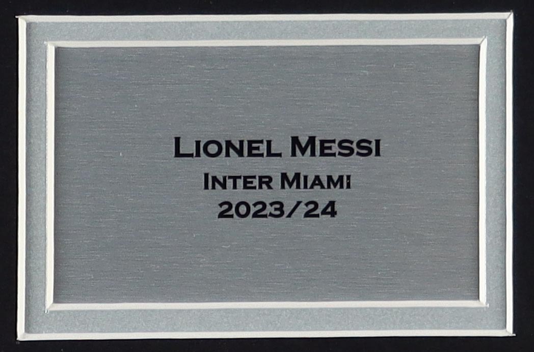 Custom framed display measures 24.5" x 32.5" in size and features a jersey of Lionel Messi. Please note, the jersey is unsigned.