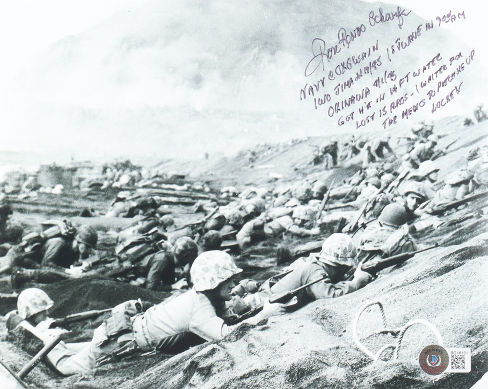 Ron Scharfe Signed World War II 8x10 Photo with Service Record Inscription (Beckett)