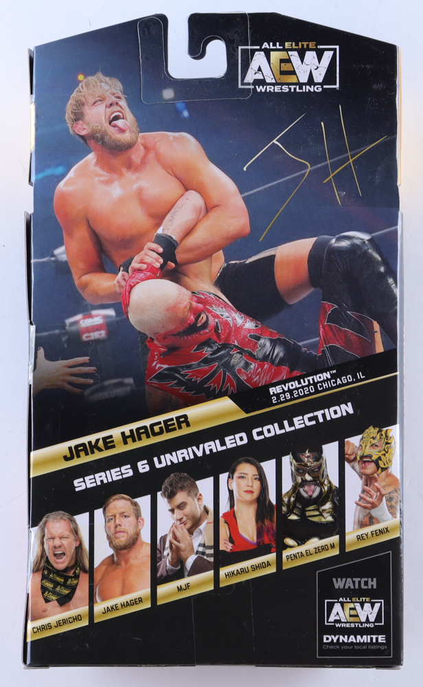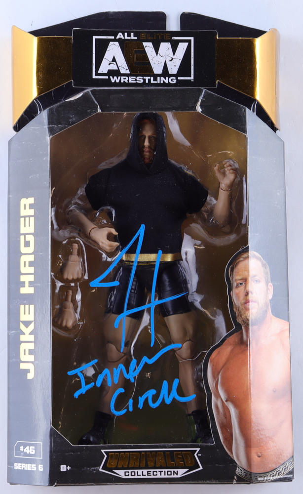 Unrivaled Series 6 #46 Collection AEW action figure. Hand-signed and inscribed by Jake Hager. Please note, there is creasing and edge wear on the original packaging.