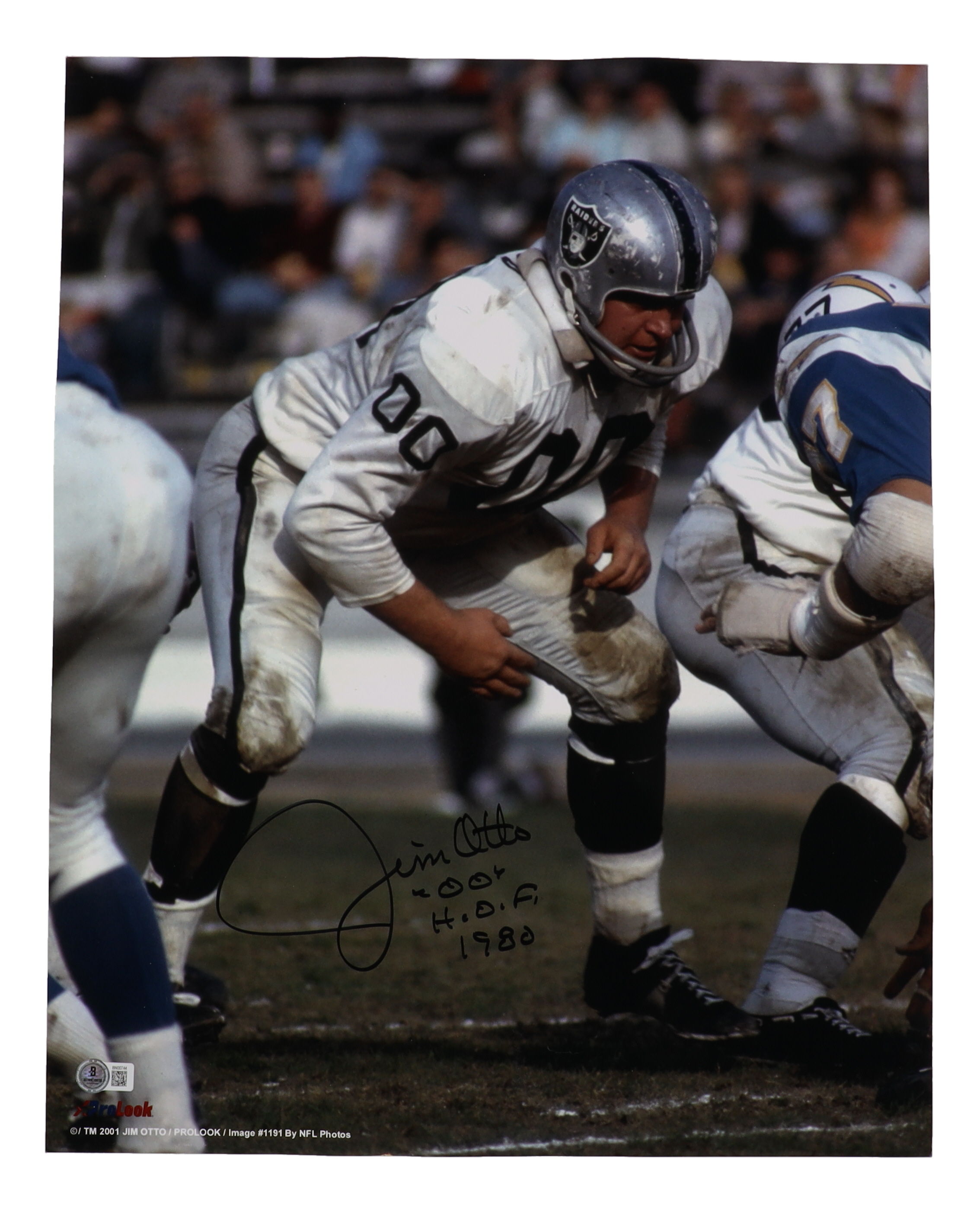 Photo measures 16" x 20" in size. Hand-signed and inscribed by Jim Otto (Oakland Raiders, HOF).