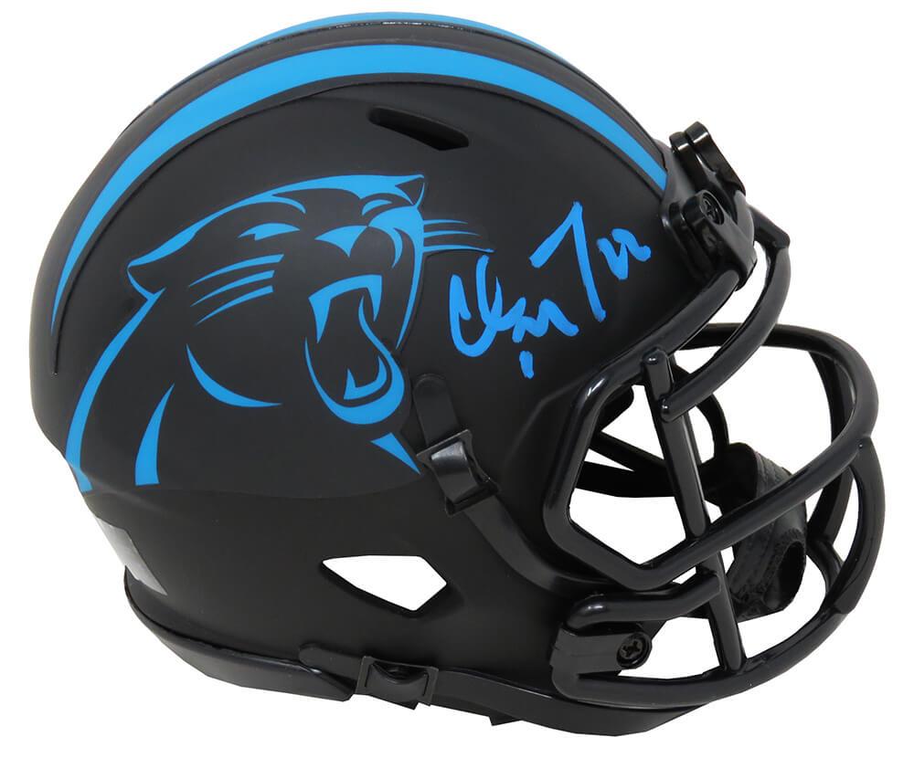 Riddell Carolina Panthers Eclipse alternate speed mini helmet. Hand-signed by Christian McCaffrey.