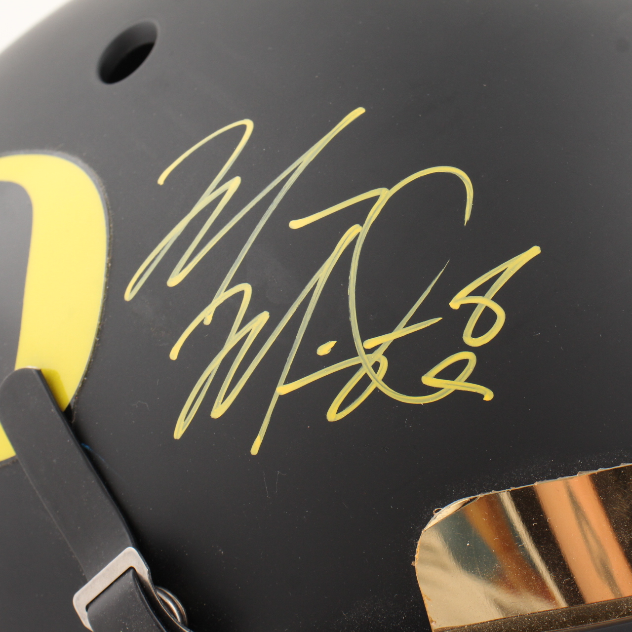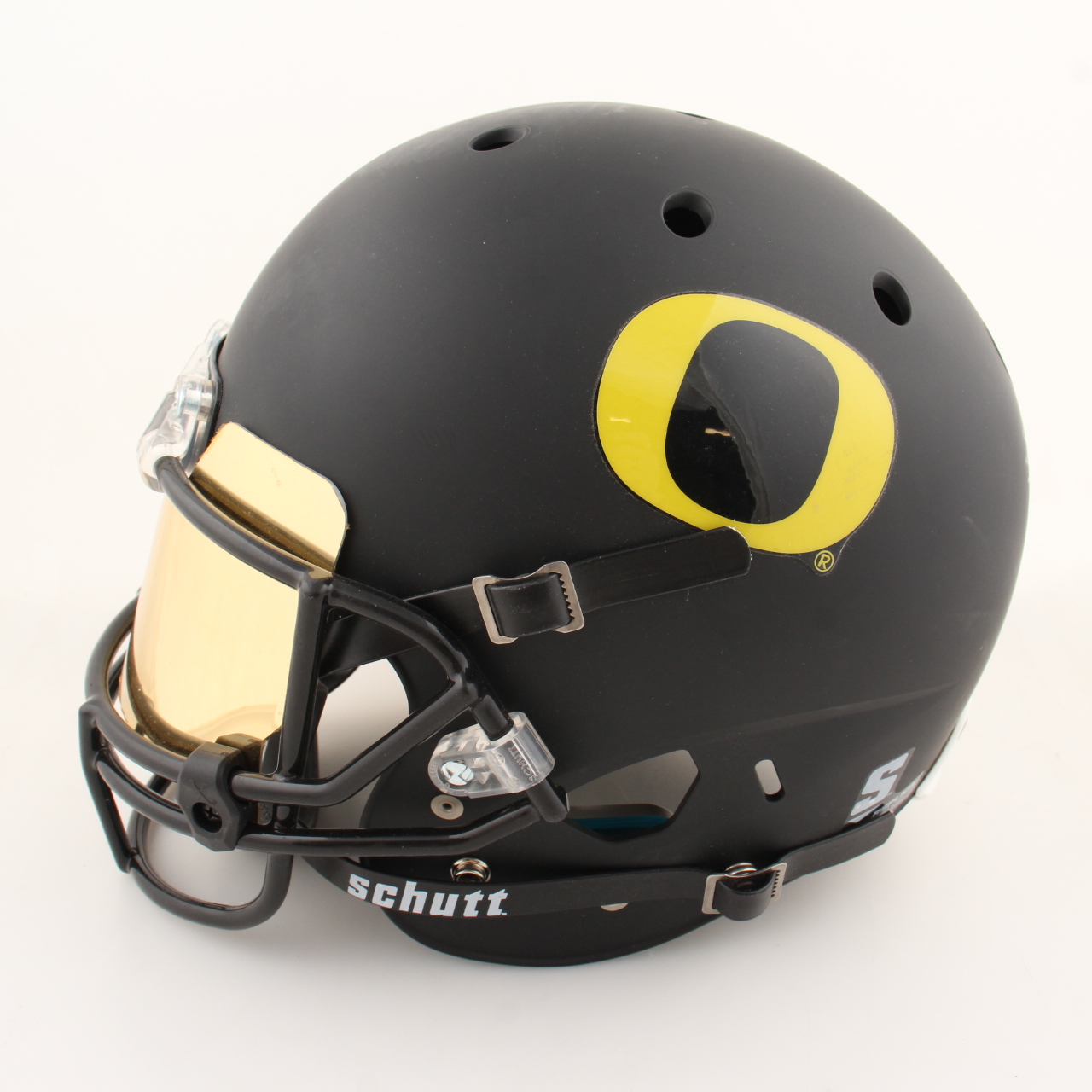 Schutt Oregon Ducks replica matte black full-size helmet with visor. Hand-signed and inscribed by Marcus Mariota.