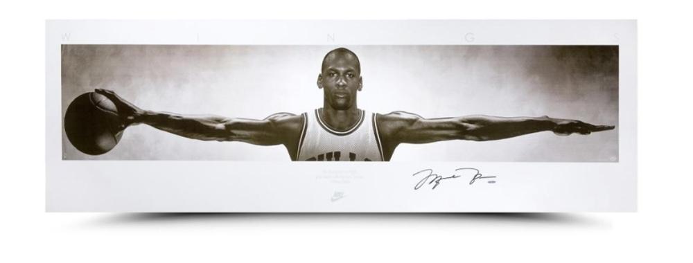 In the 1980s and 1990s, Nike's impact on popular culture exploded through the roof thanks to memorable products and promotional campaigns inspired by its top basketball spokesperson, Michael Jordan. One of Nike's most enduring productions from the height of the Air Jordan era is its famous "Wings" poster of the Chicago Bulls legend. Upper Deck brings back this classic poster with a new twist: Michael Jordan's autograph. Inked by M.J. in black pen, the autograph stands out impressively on the 72" wide x 23" high black-and-white print. Meanwhile, the reproduction of the iconic promotional poster is complete with its original details: the vintage Nike logo as well as the following quote from the poet William Blake: "No bird soars too high, If he soars with his own wings." Jordan's signature is guaranteed authentic through Upper Deck Authenticated's five-step process. Certified authentic with Upper Deck hologram and certificate
