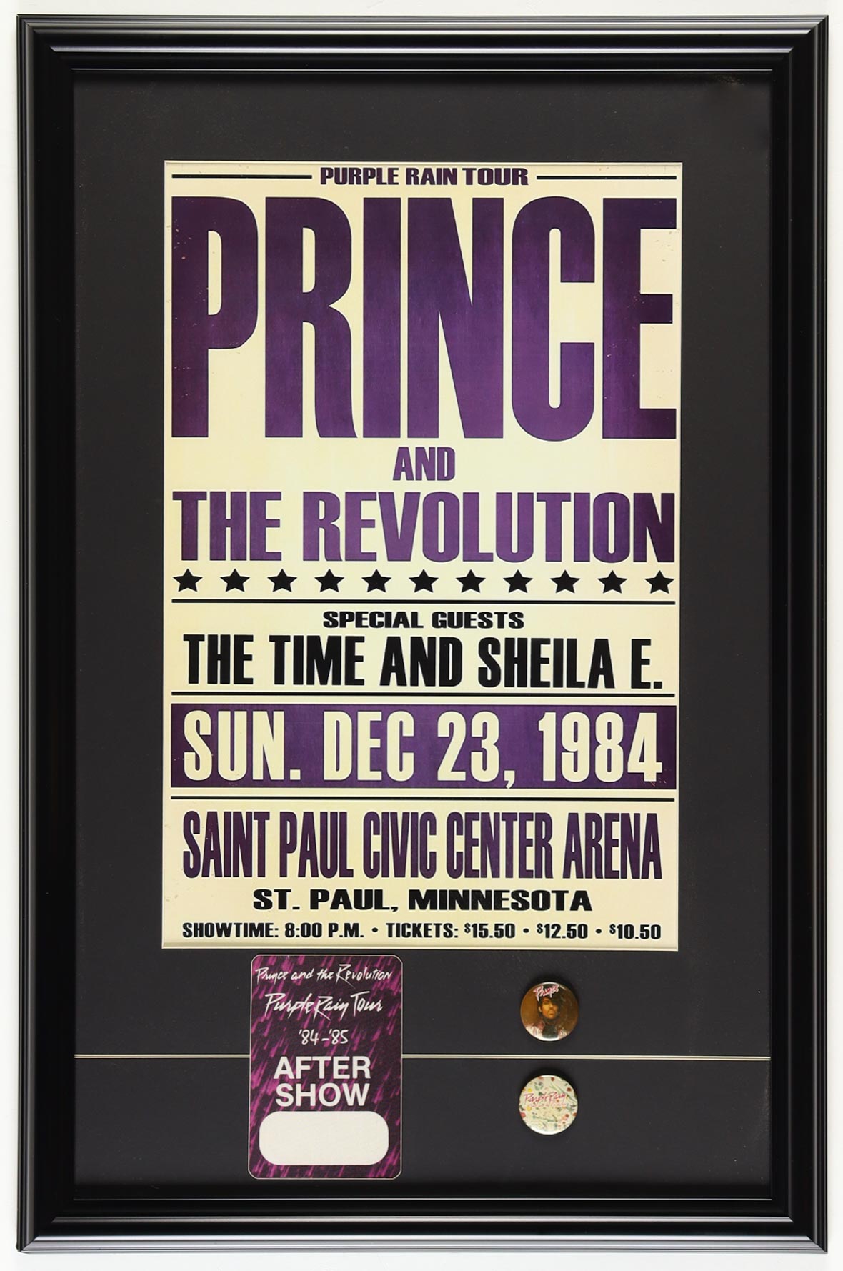 Custom frame measures approximately 17.25" x 26.25" in size and features a "Prince and the Revolution Purple Rain Tour" concert poster, original 1984-1985 vintage after show pass, and (2) concert pins. Please note, the display is unsigned and there is some scuffing on the frame.