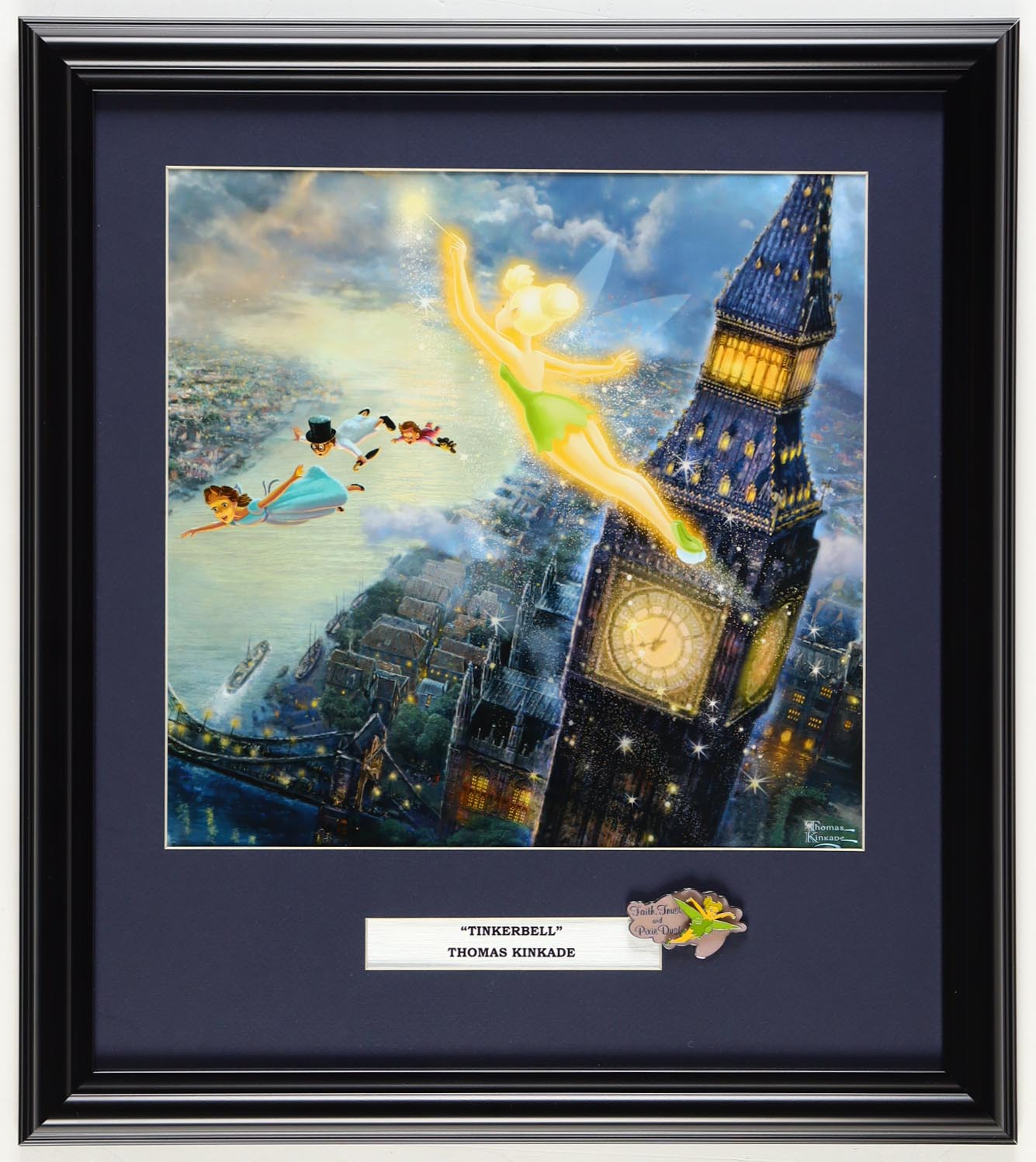 Custom frame measures approximately 16.25" x 18.25" in size and features a print from "Peter Pan" by Thomas Kinkade (D. 2012). Display also features a Tinkerbell character Pin. Please note, the display is unsigned.